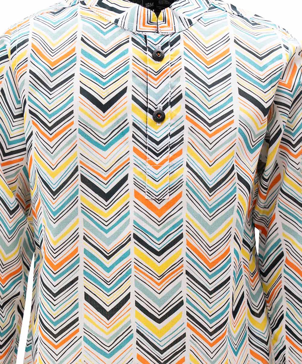 Newborn Baby boys’ printed panjabi in cotton fabric. Mandarin collar, inseam pockets and long sleeves.