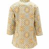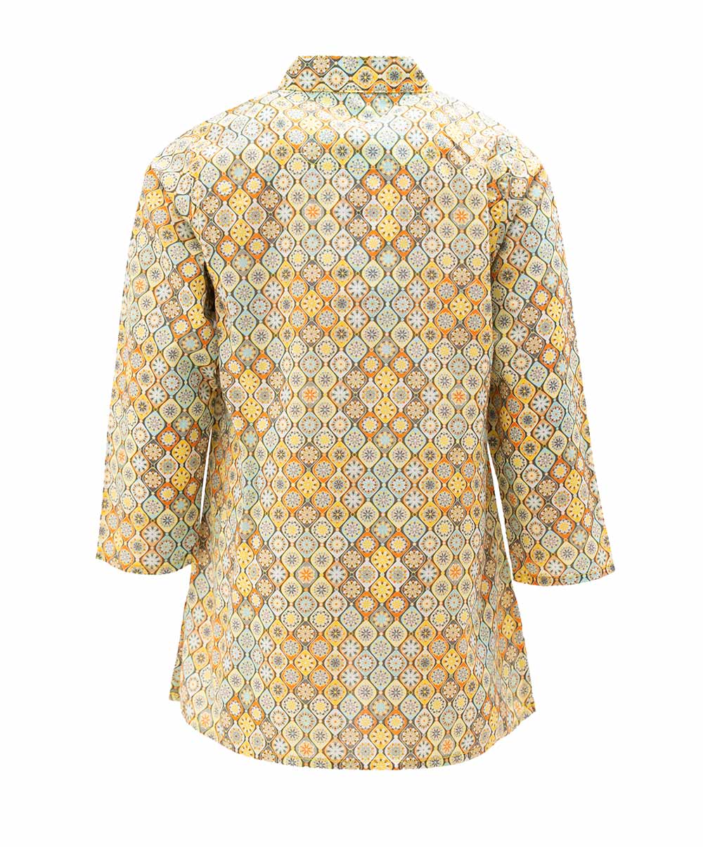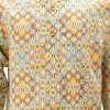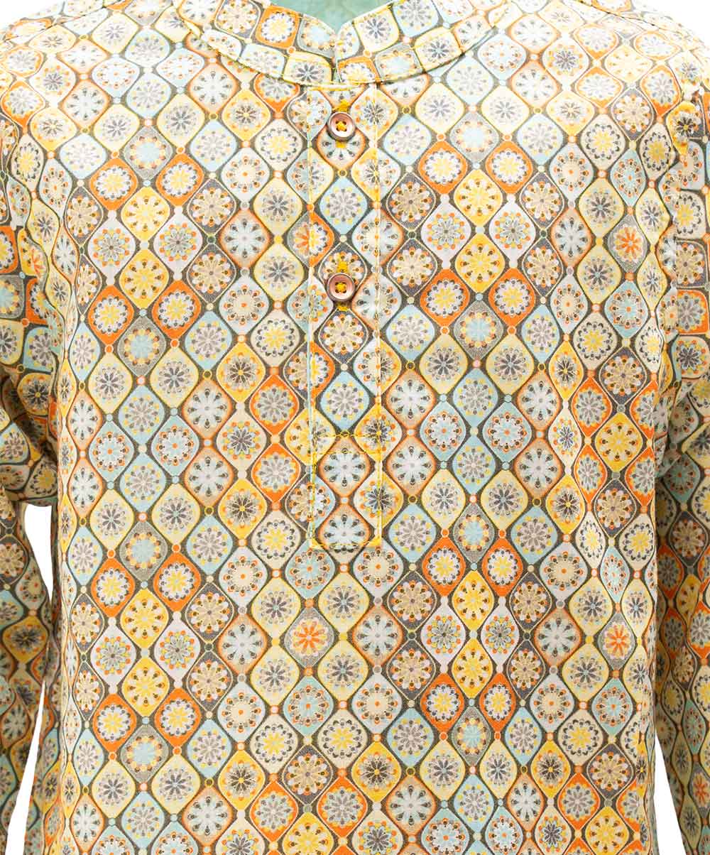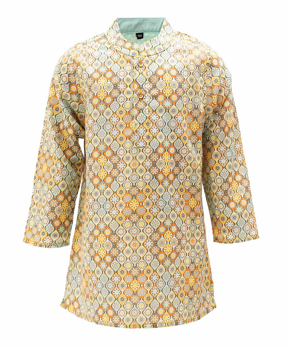 Newborn baby boy’s printed panjabi in cotton fabric. Mandarin collar, inseam pockets and long sleeves.