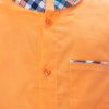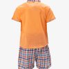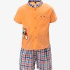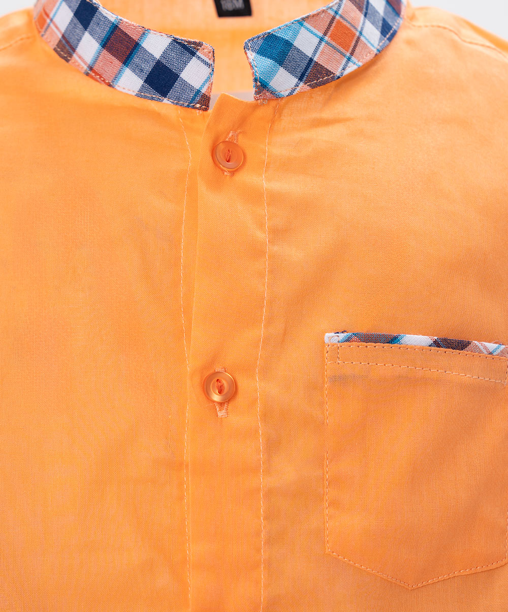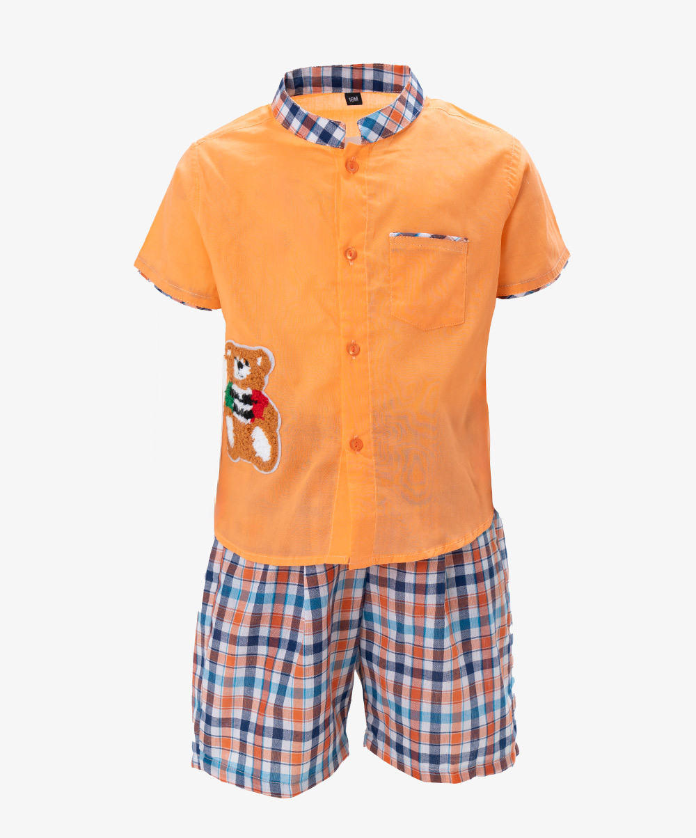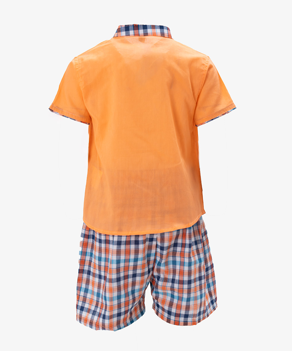 Newborn baby boys shirt pant set in cotton fabric. Stand collar, short-sleeved. Button fastening at the front and a chest pocket. Paired with check-printed baby pants.