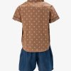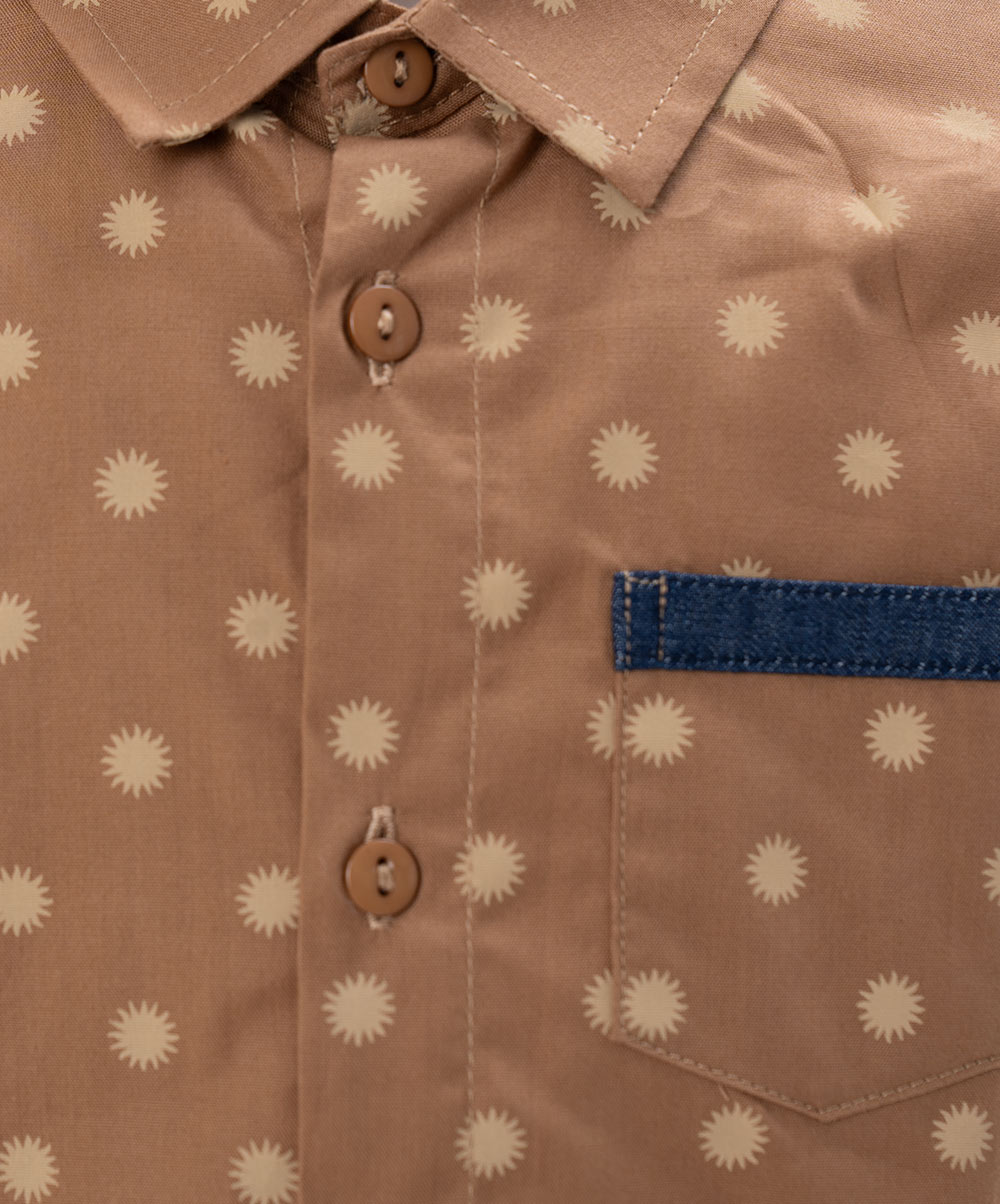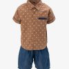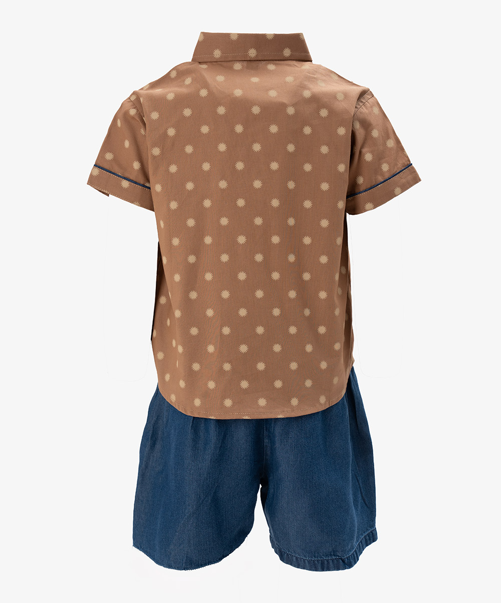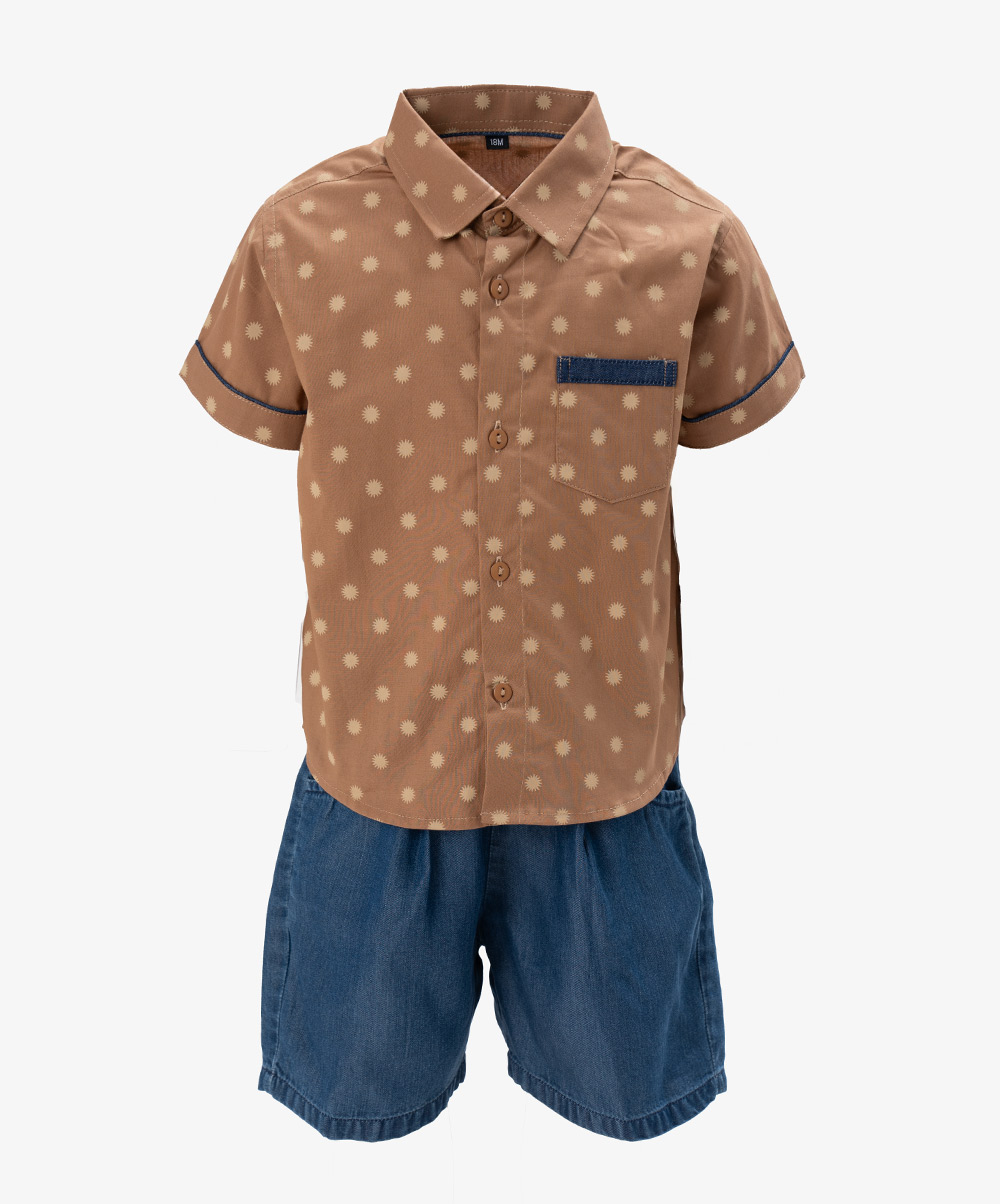 Newborn baby boy’s shirt pants set in cotton fabric. Classic collar, short sleeves and a chest pocket shirt & denim short pants.