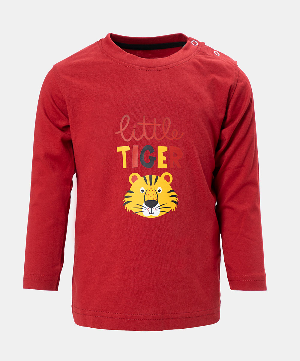 Newborn baby boys full sleeves t-shirt in cotton single jersey fabric. Round neck with snap button. Cartoon print at the front.