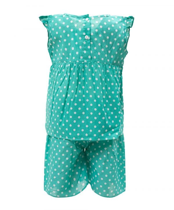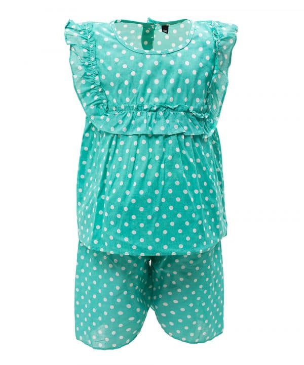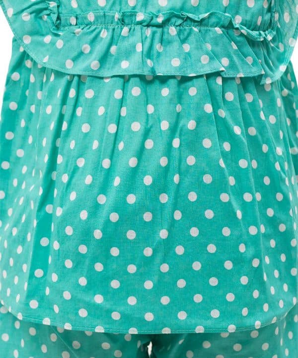 Newborn girl’s polka dot printed top bottom set in cotton fabric. Sleeveless, round neck, frill at the front. Paired with baby pants.