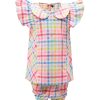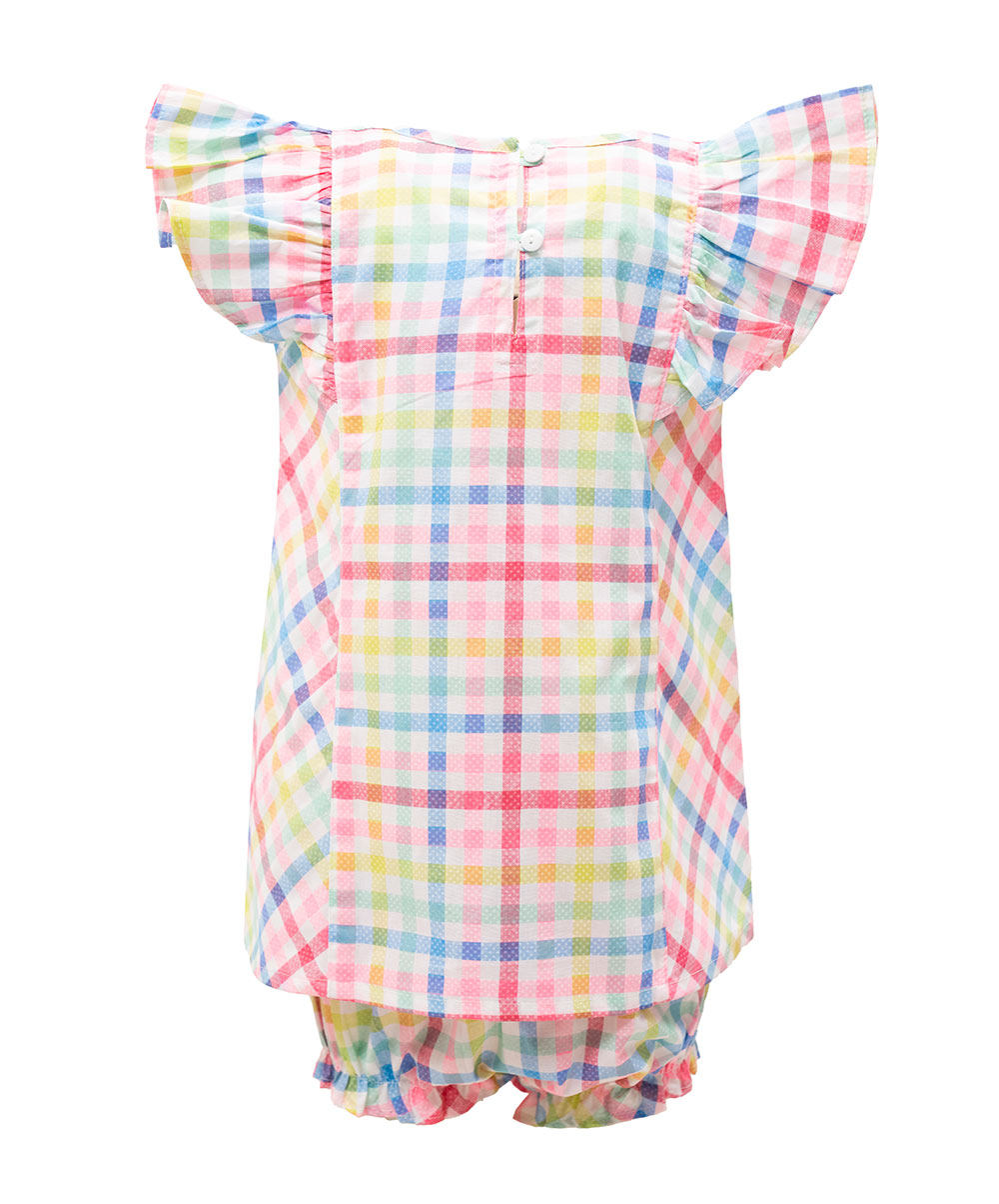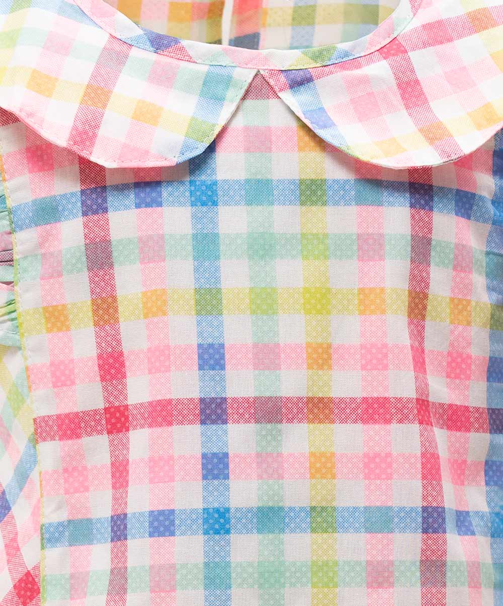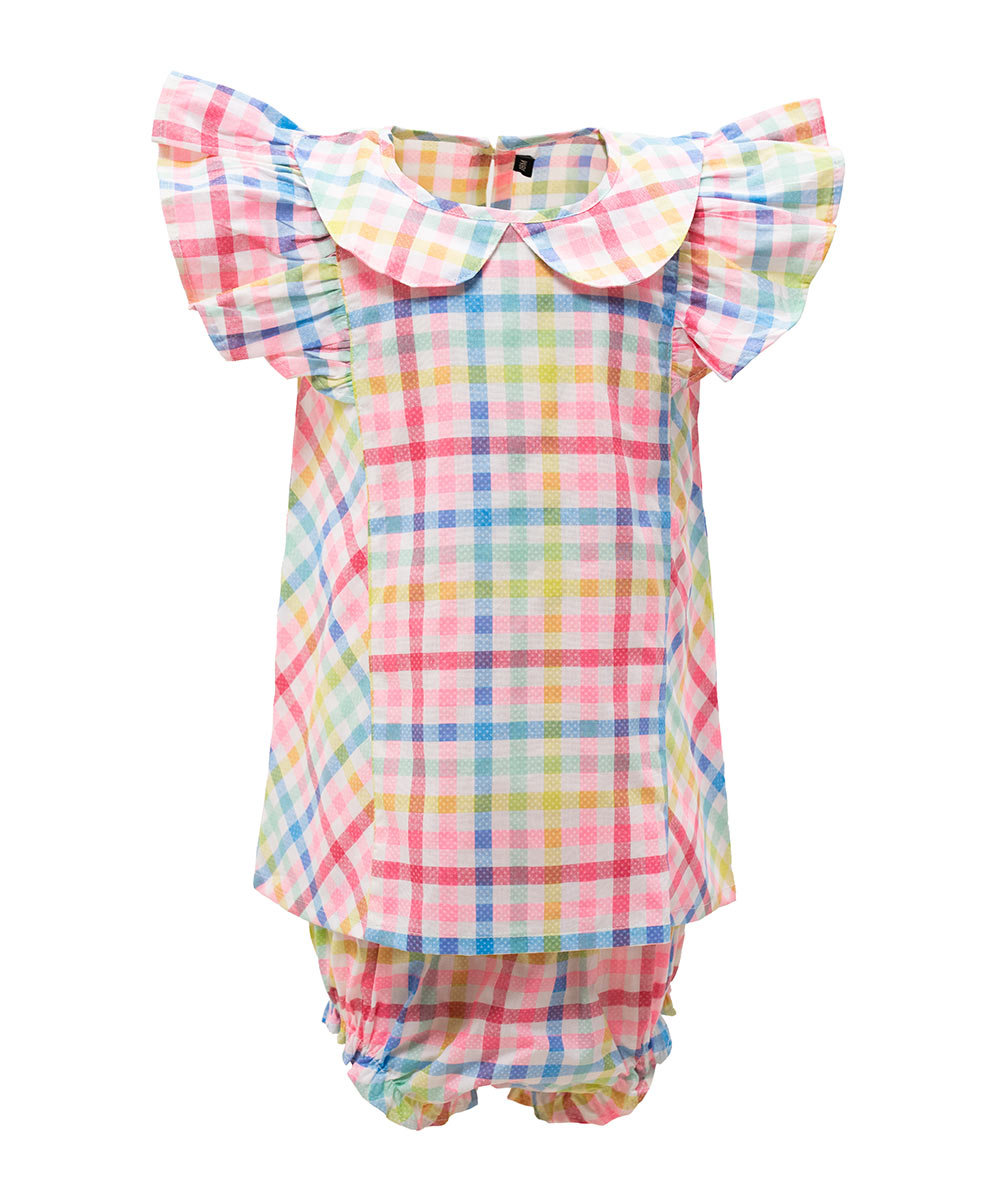 Newborn baby girls check printed frock & pant set in cotton fabric. Raffel sleeves and baby collar.