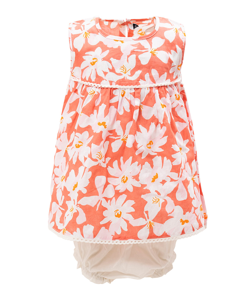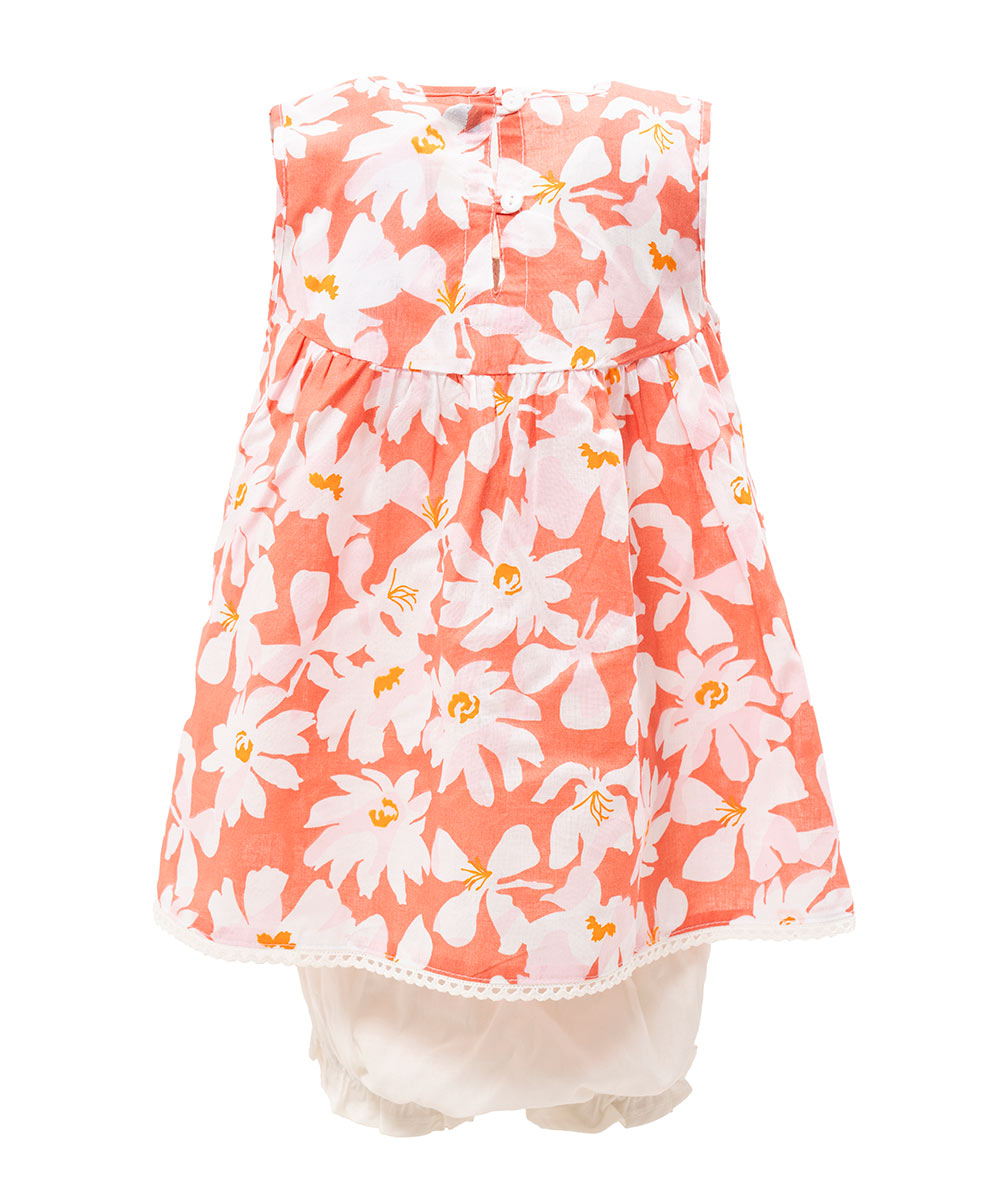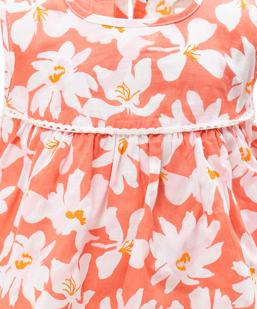 Newborn baby girls floral printed frock & pant set in cotton fabric. Sleeveless, round collar and lace attached at front.