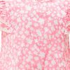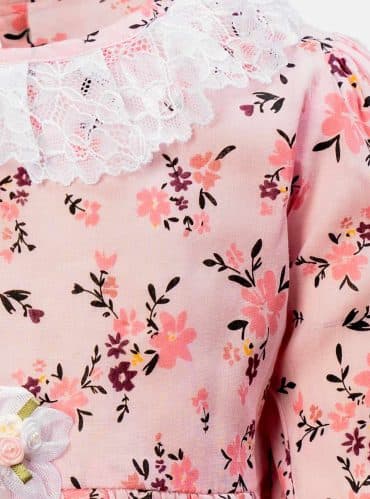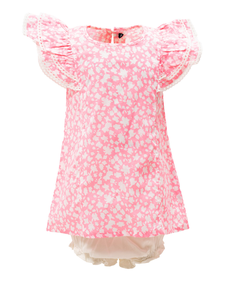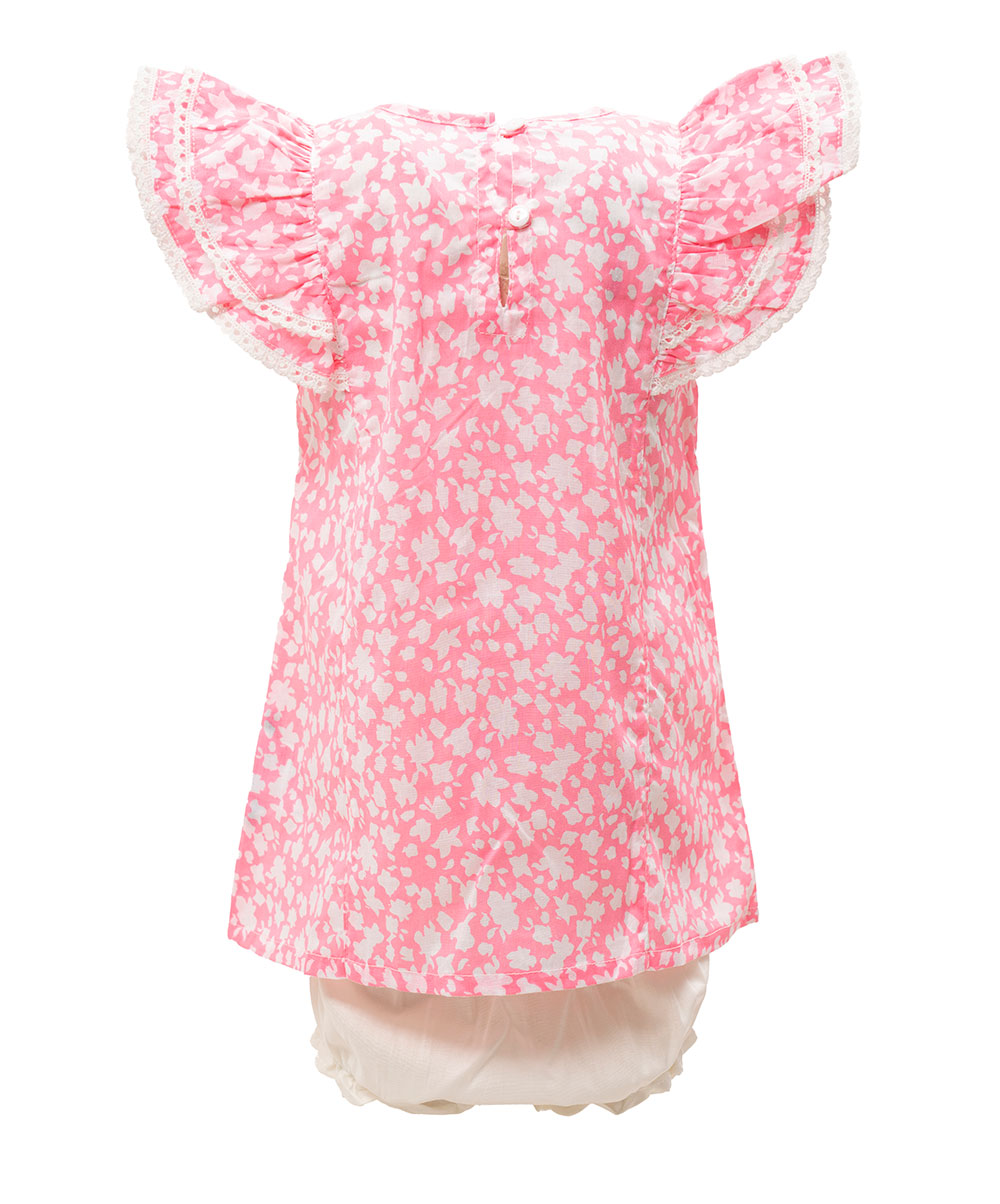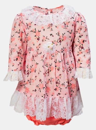 Newborn girls’ printed frock and pant set in cotton fabric. Short sleeve with patch attached, round neck. Paired with a baby pant.