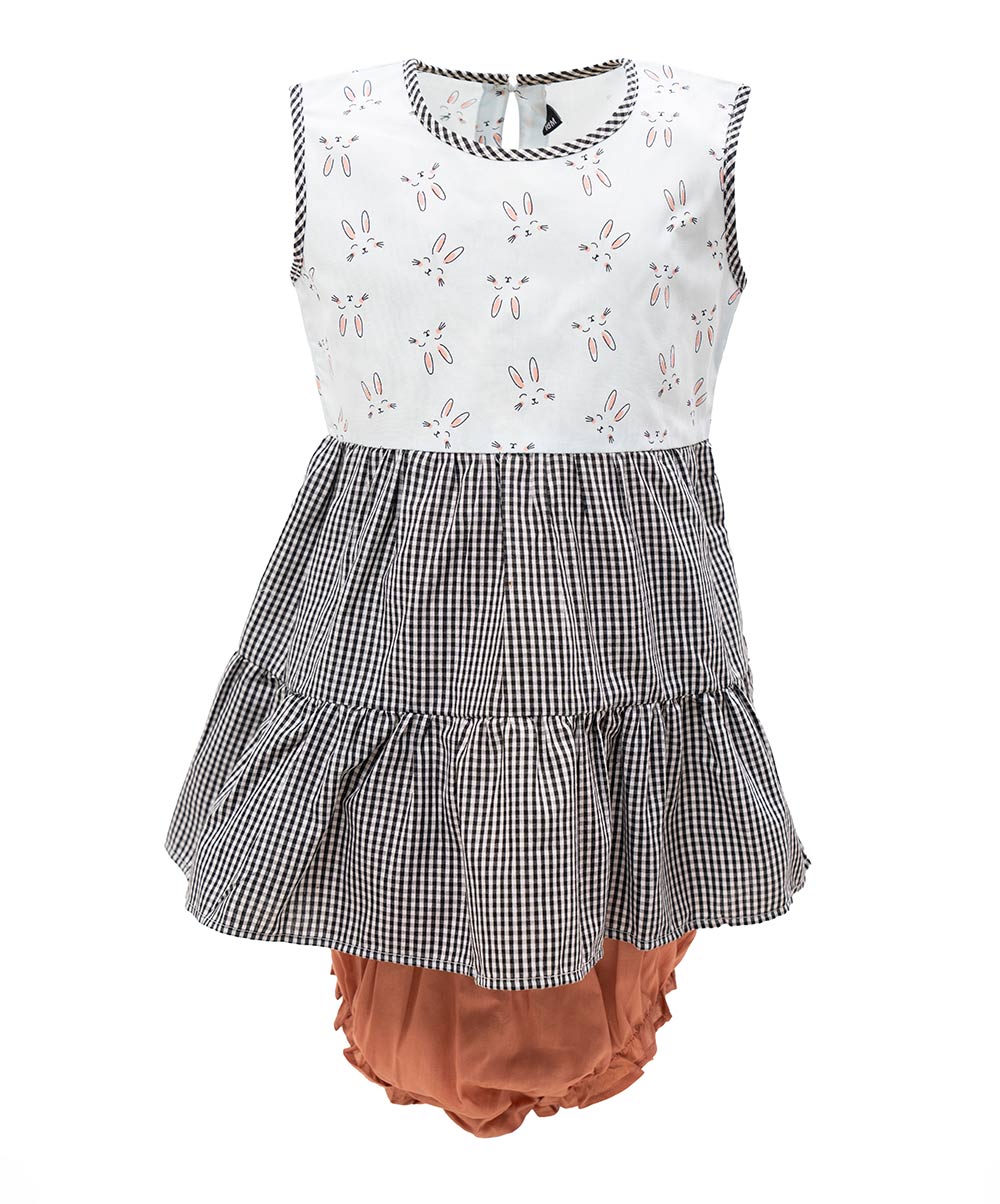 Newborn baby girls check printed frock & pant set in cotton fabric. Sleeveless, round collar.