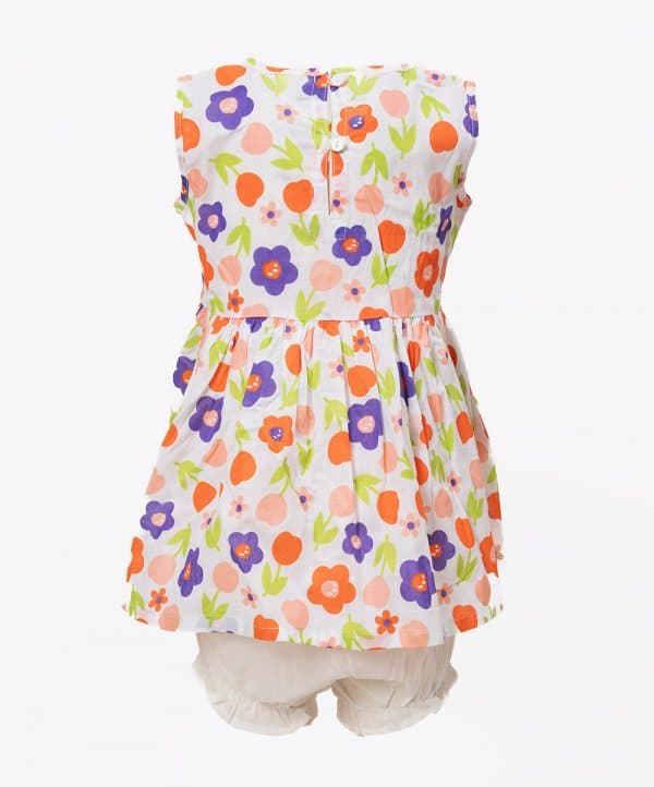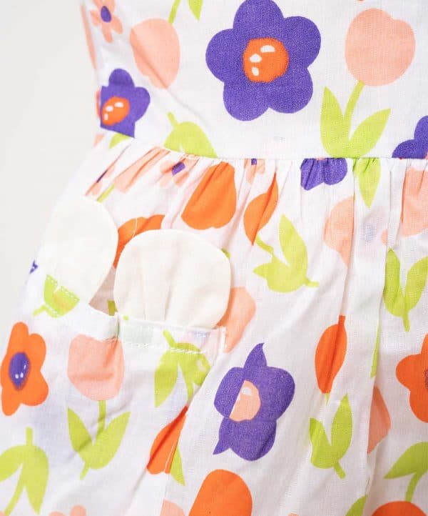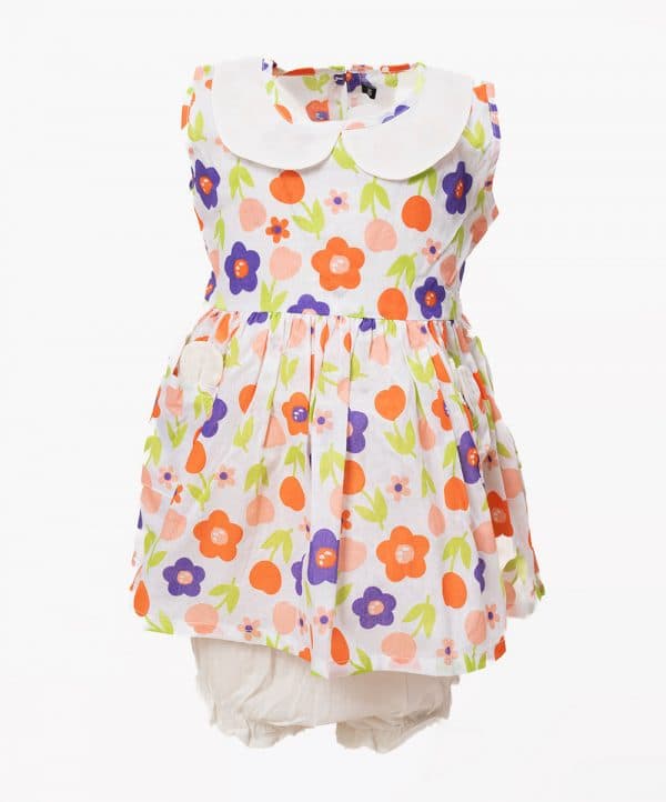 Newborn baby girls printed frock & pant set in cotton fabric. Sleeveless, Peter-pan collar. Gathered waistline & two front bunny ear pockets.