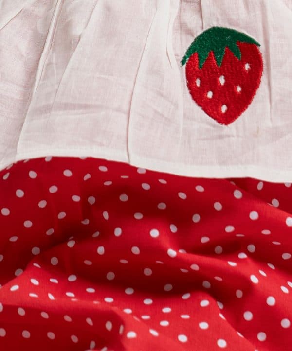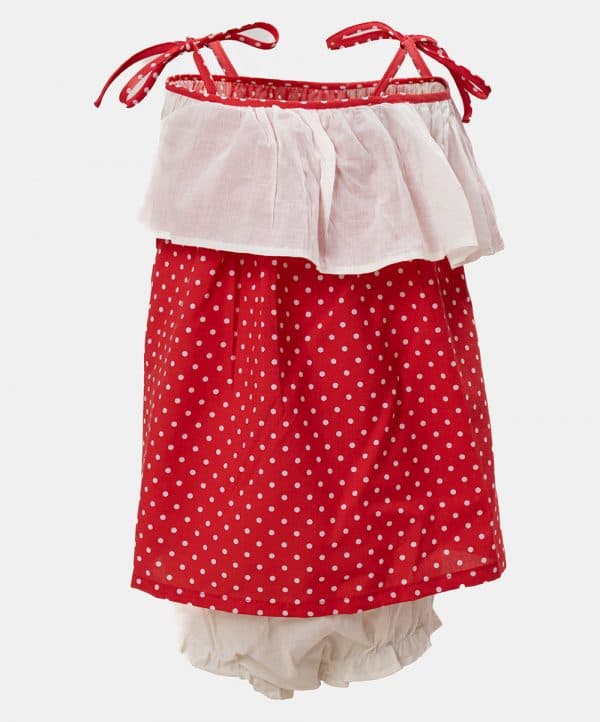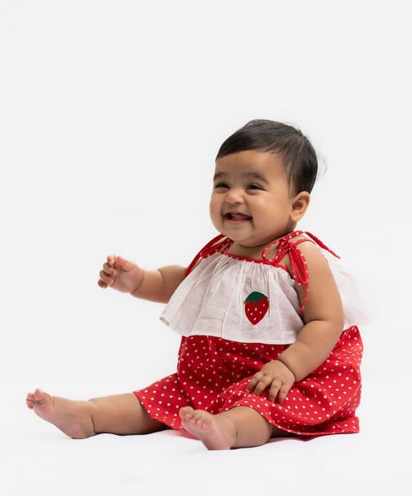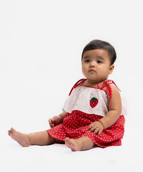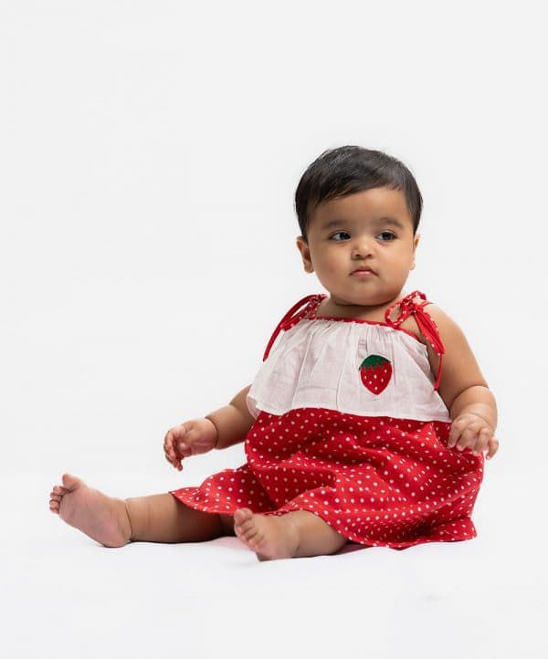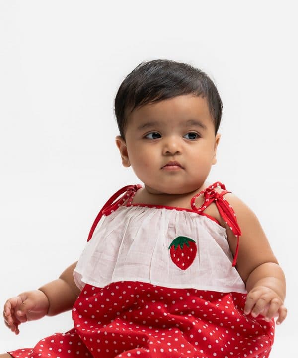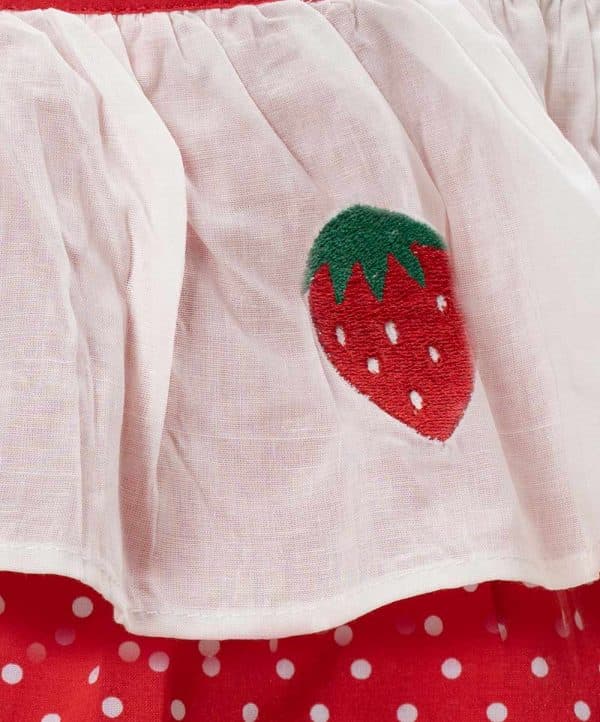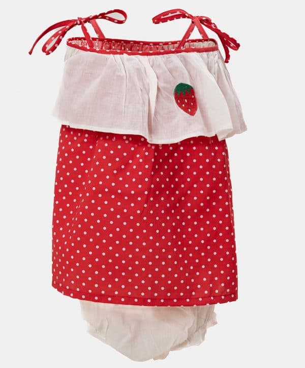 Newborn baby girls polka dot printed tent-style frock & pant set in cotton fabric. Sleeveless, patch and strawberry embroidery at front.