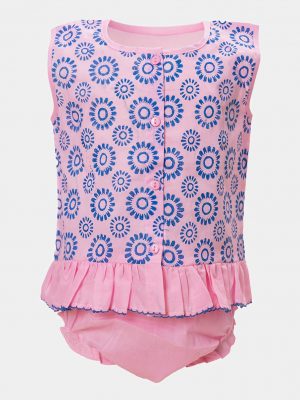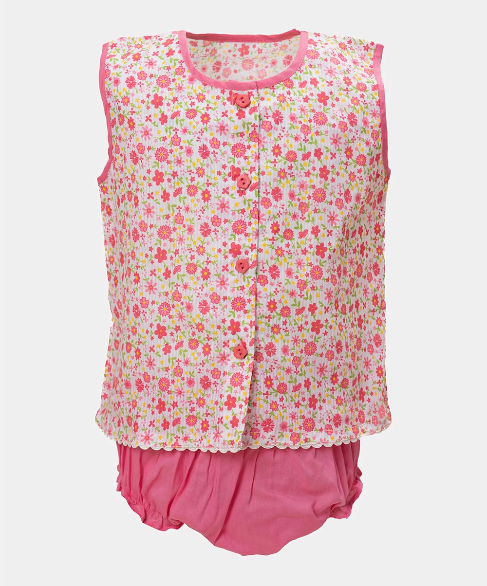 Newborn baby girls nima set in cotton fabric with short pant set. Round neck, sleeveless. Lace at hemline.
