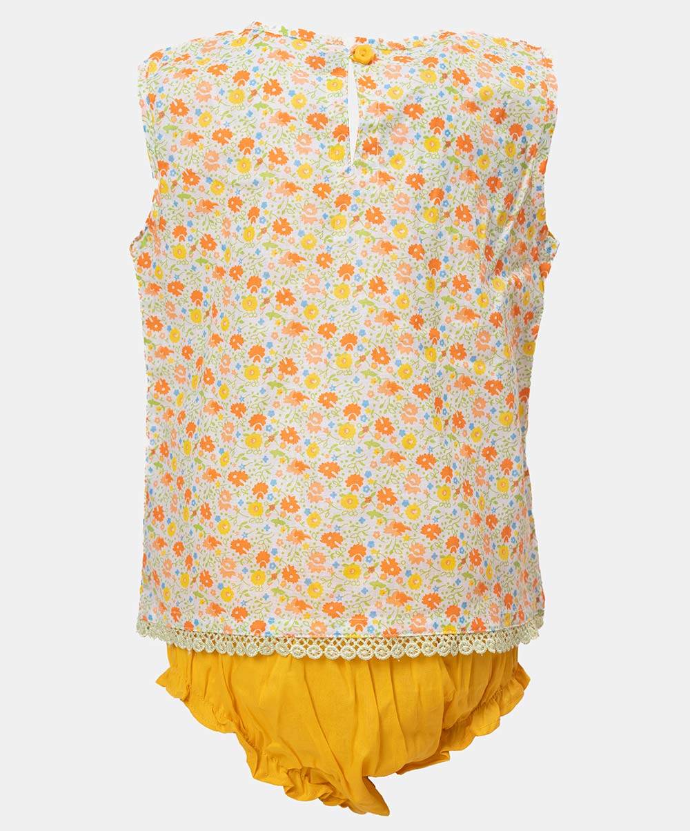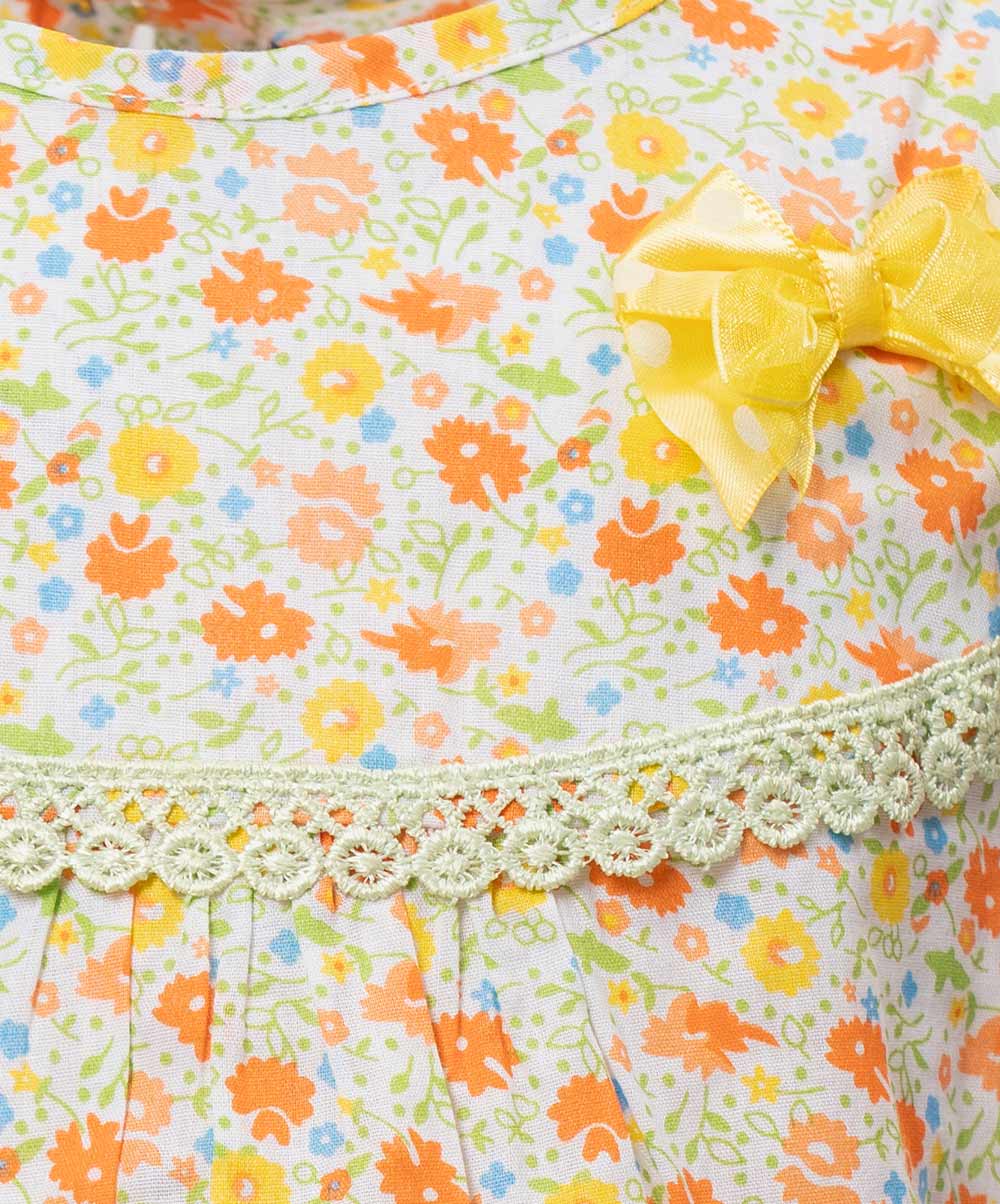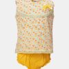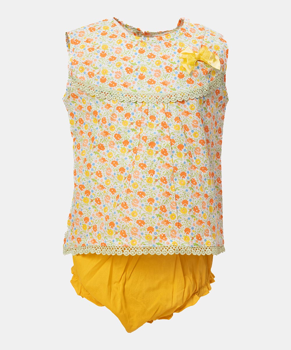Newborn baby girls nima set in cotton fabric with short pant set. Round neck, sleeveless. Bow attached and lace at the front.
