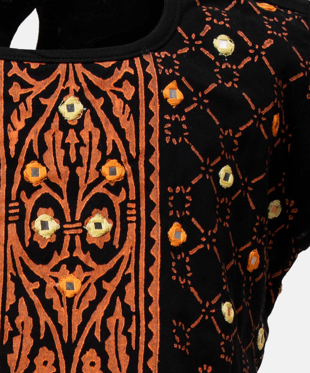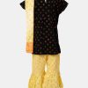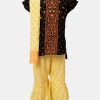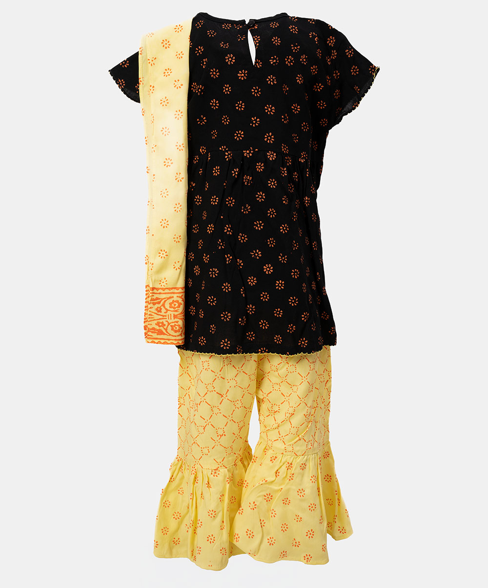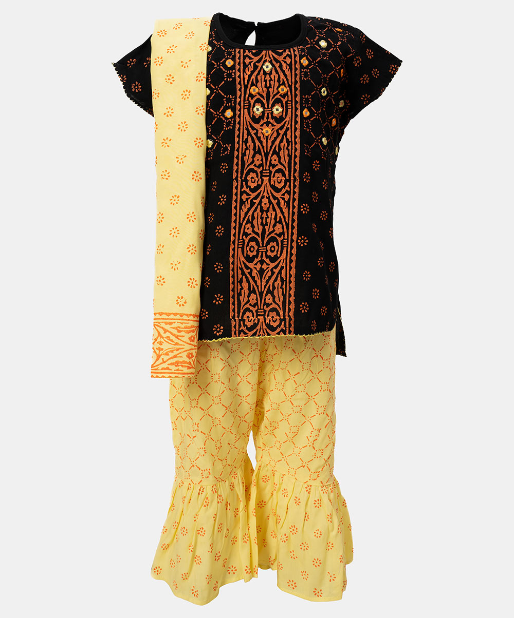 Newborn baby girl salwar kameez in cotton fabric. Sleeveless top has A-line hem and karchupi at front. Cotton dupatta with pajamas.
