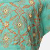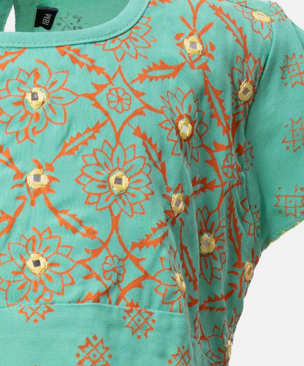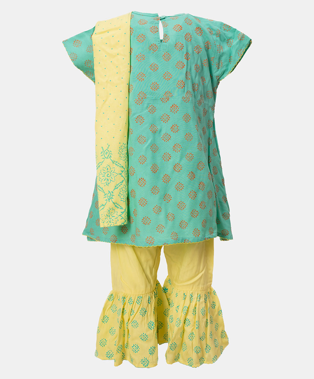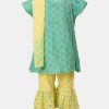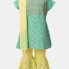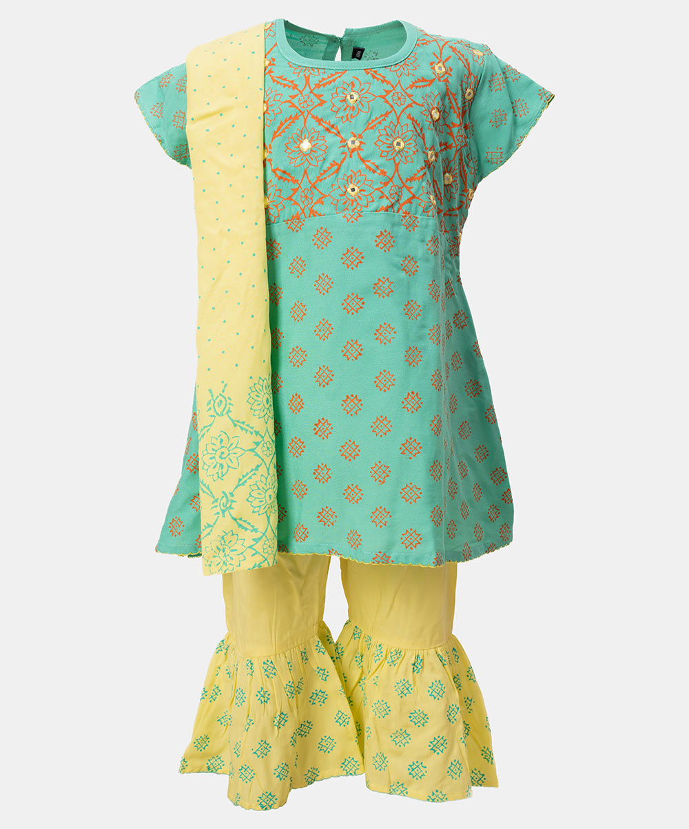 Newborn baby girl salwar kameez in cotton fabric. Sleeveless top has A-line hem and karchupi at front. Cotton dupatta with pajamas.