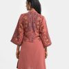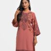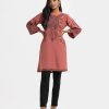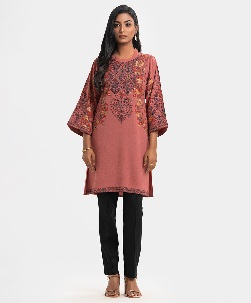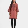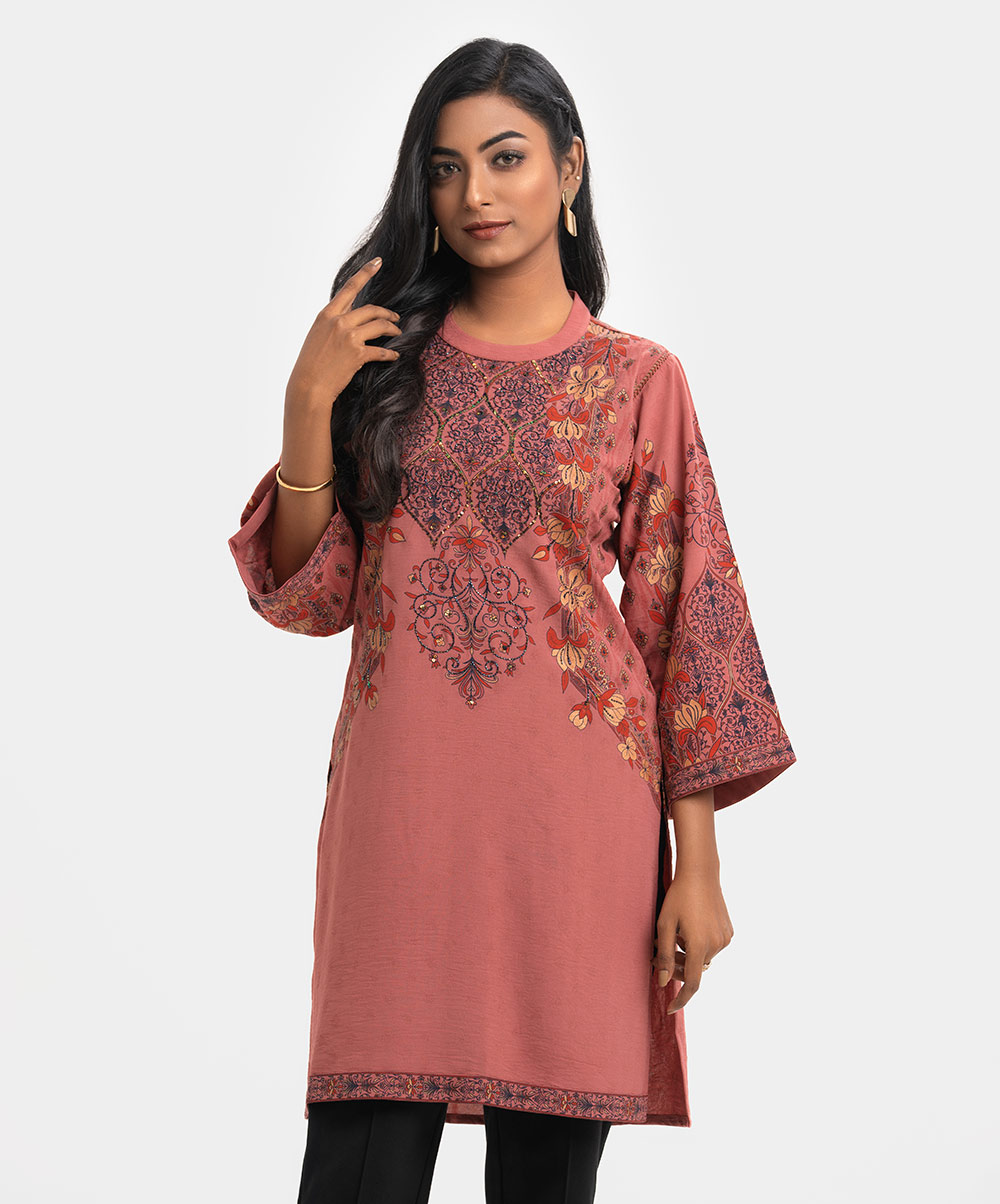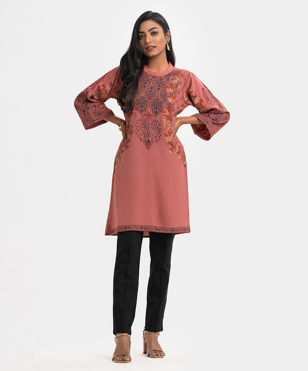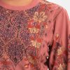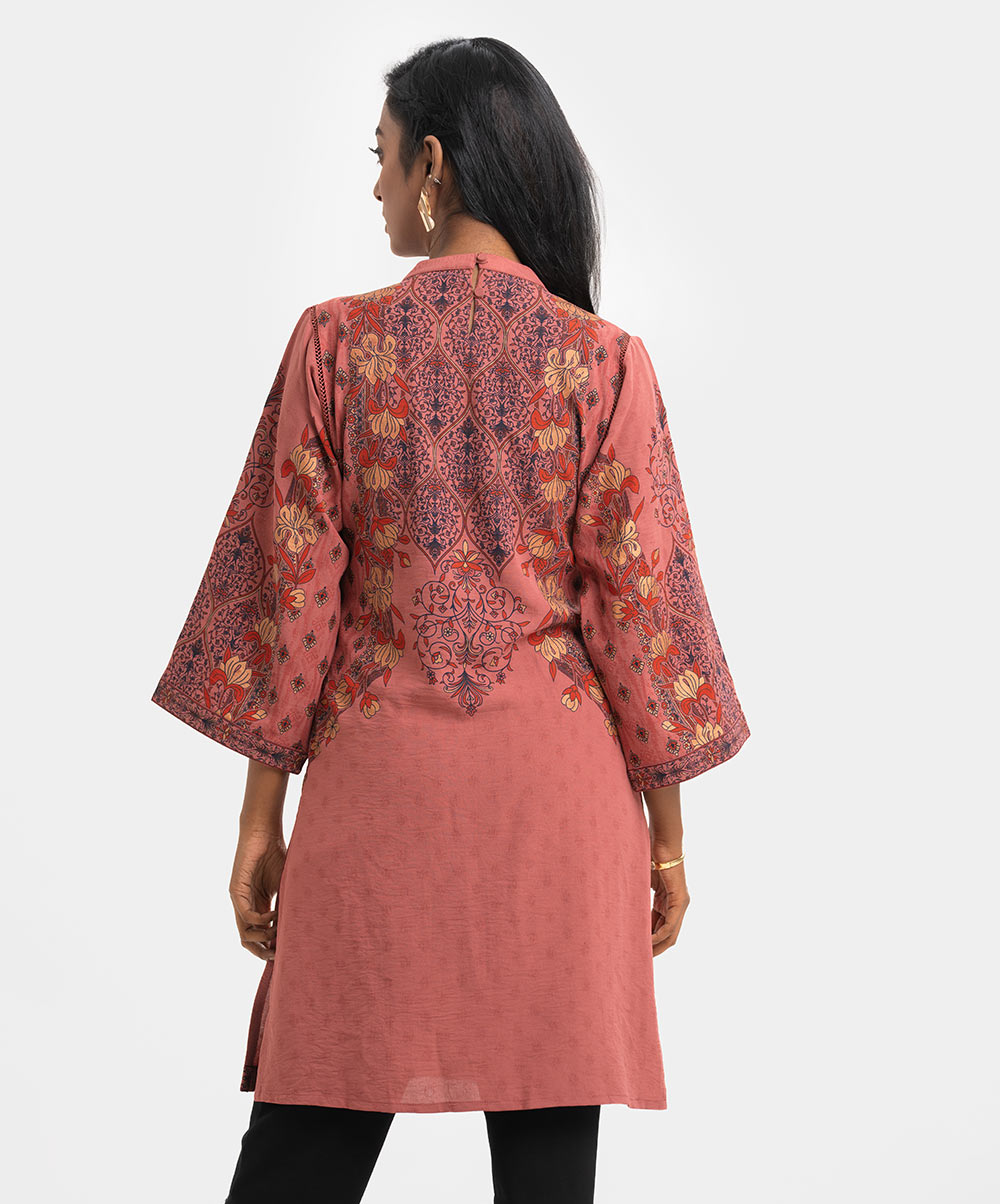 Women’s A-line printed kameez in georgette fabric. Kimono sleeves, mock neck. Detail karchupi work & lace attached at front.