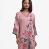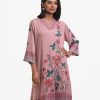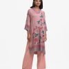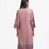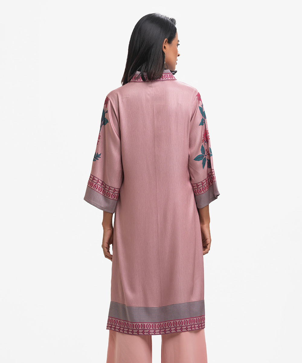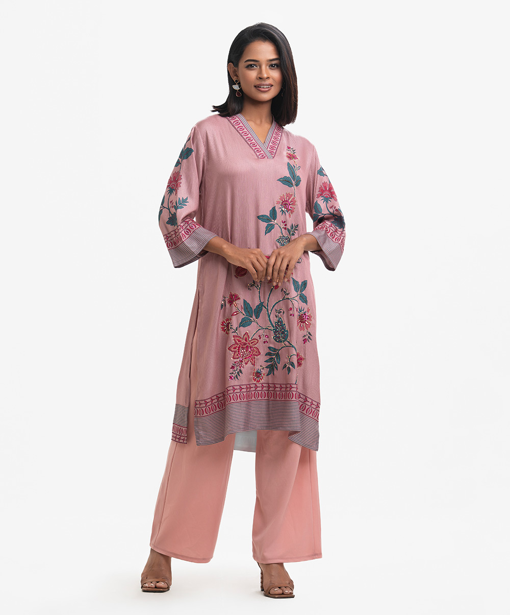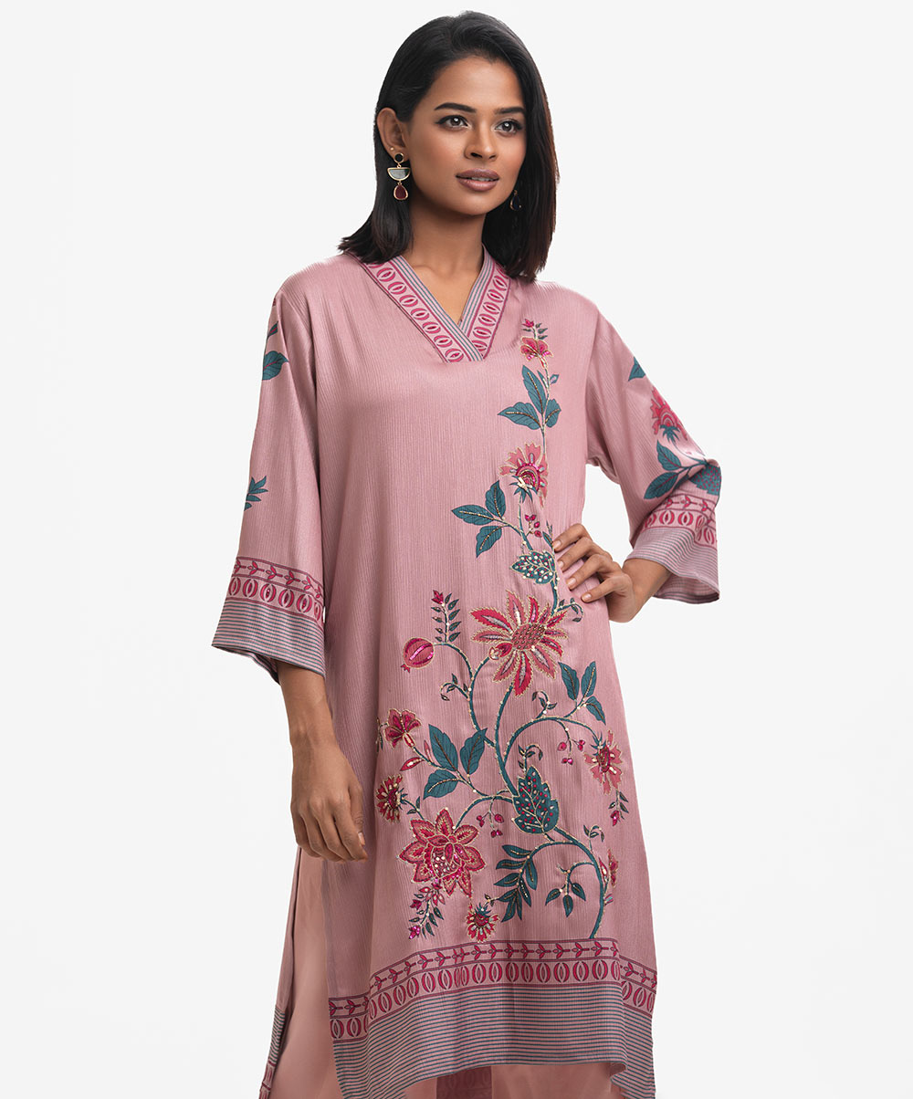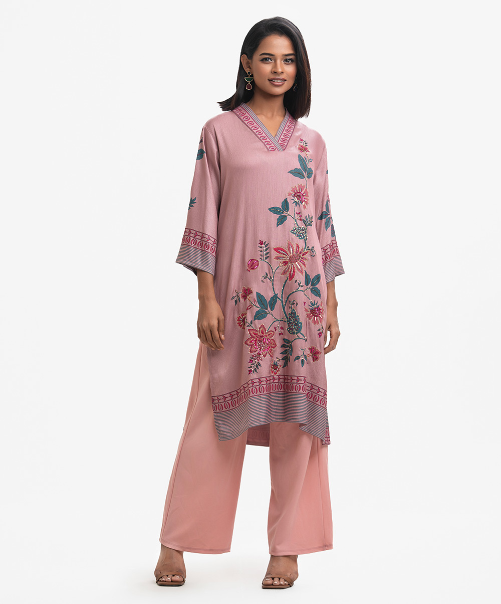 V-neck A-line kameez in soft georgette with a sheen. Three-quarter sleeves. Karchupi detailed.