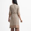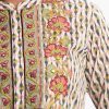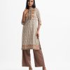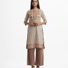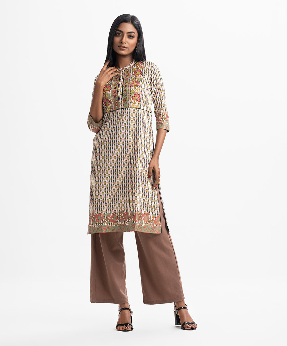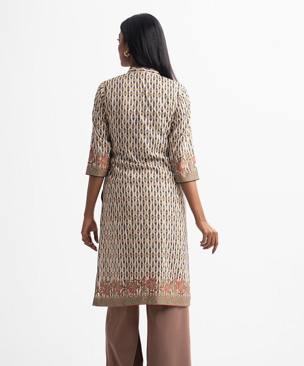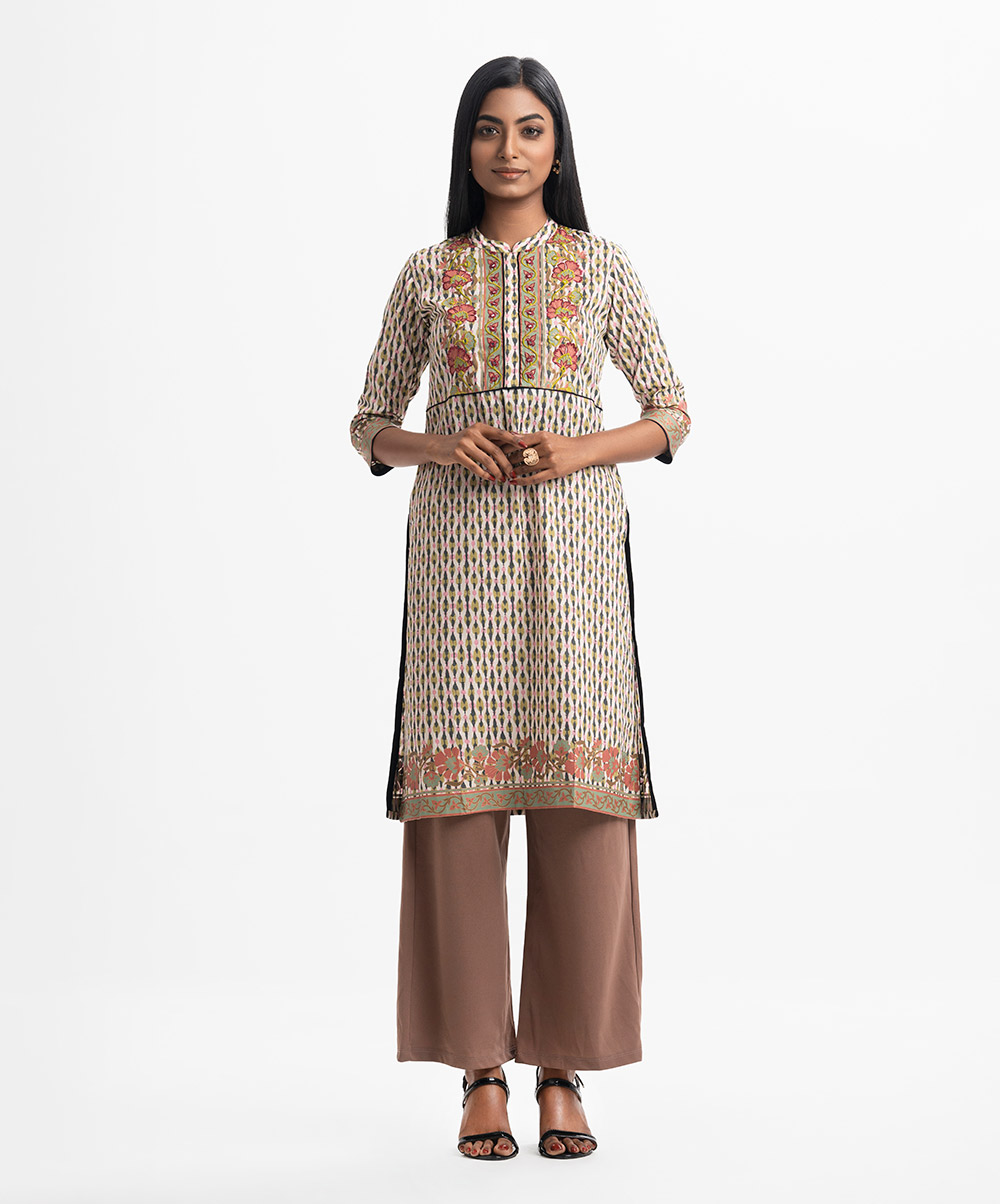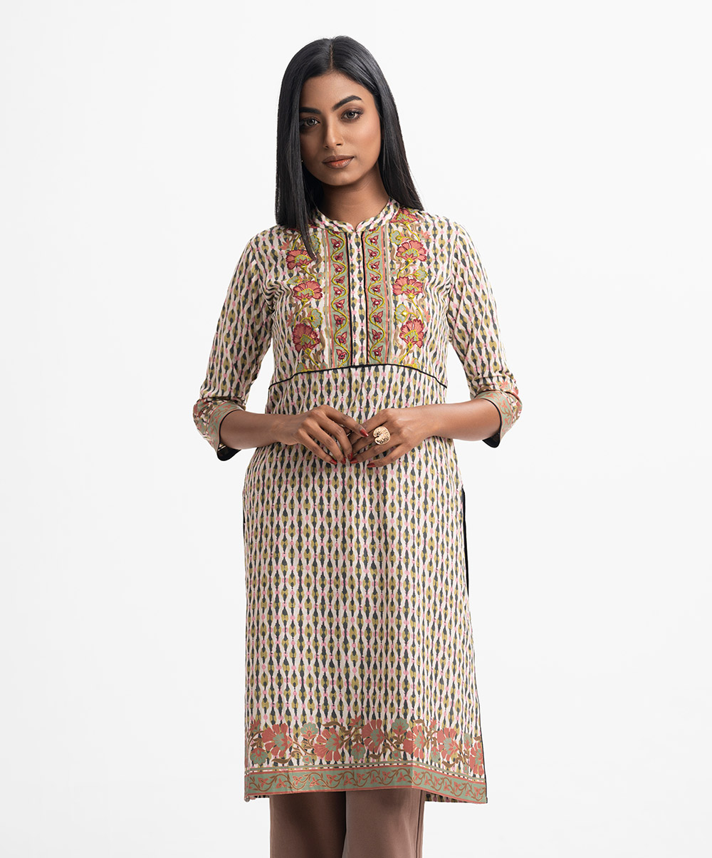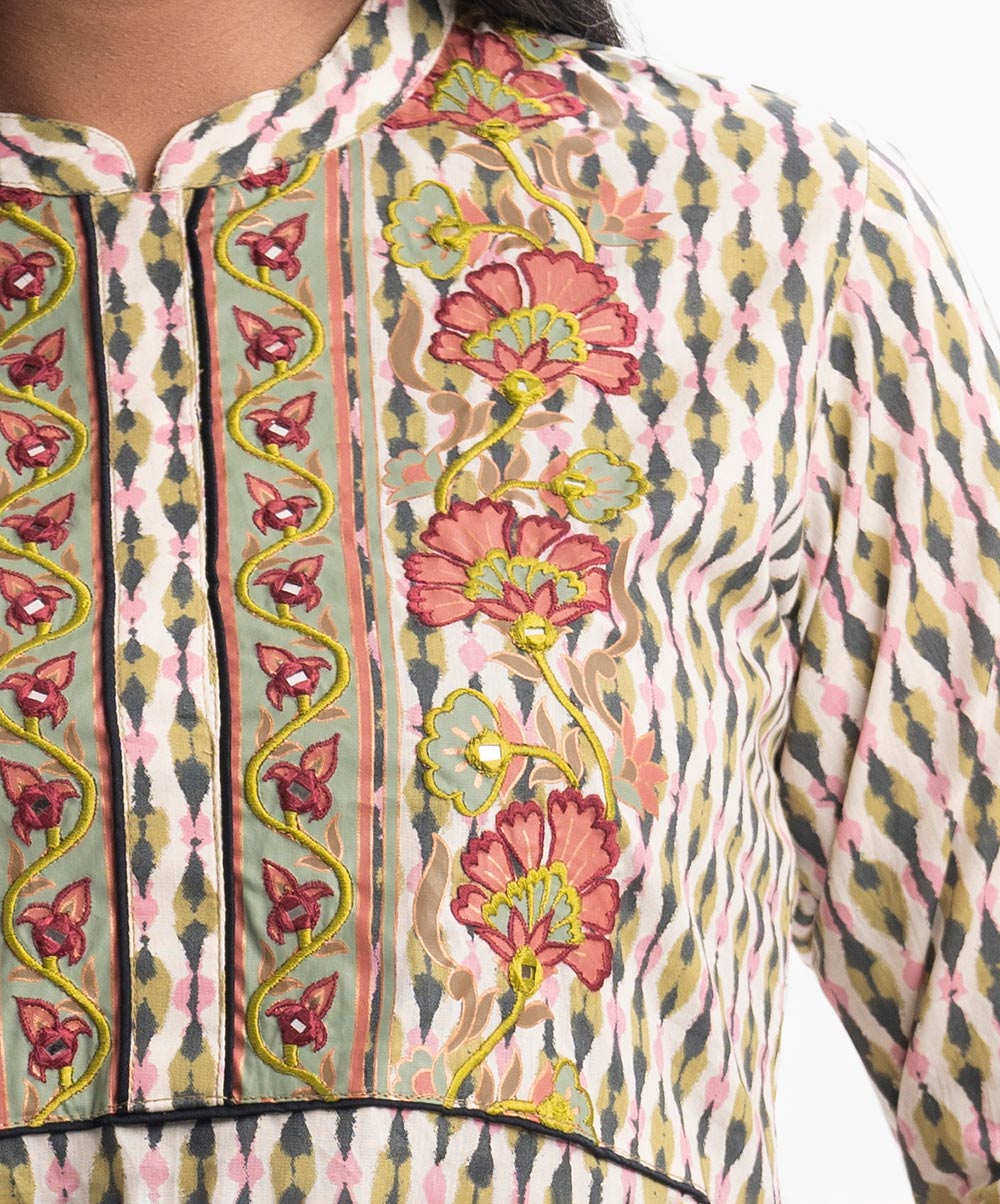 Band-collar A-line kameez in cotton fabric. Three-quarter sleeves. Karchupi at the front.