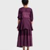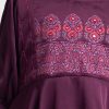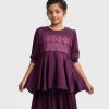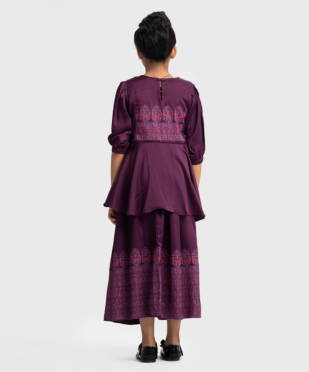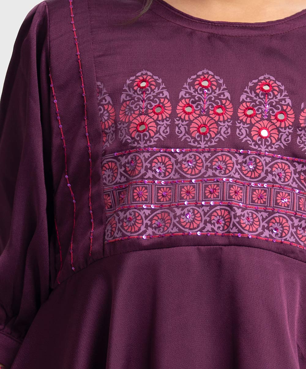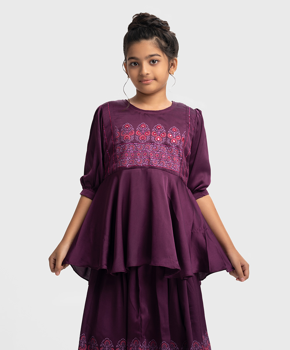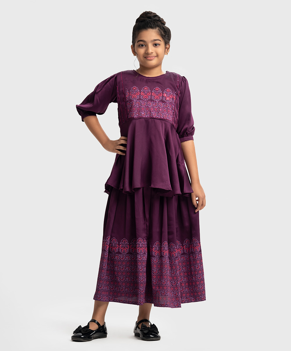 Round-neck salwar kameez set, combining a peplum top and skirt in crepe fabric. Puff sleeves, karchupi at the front.