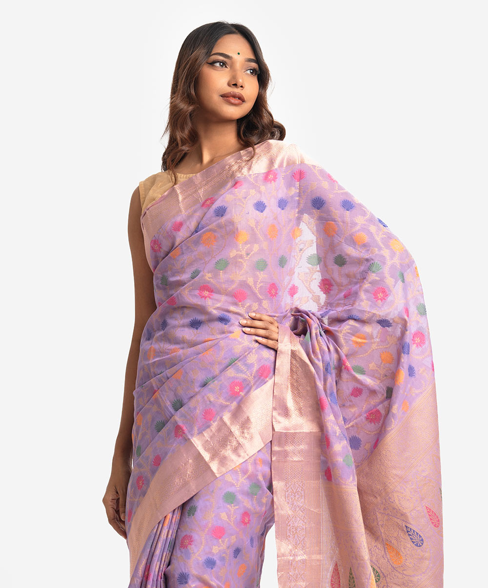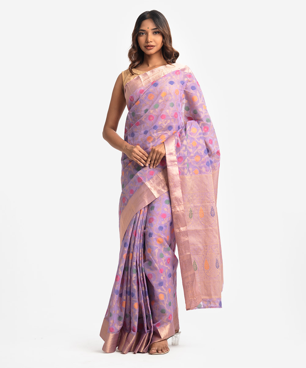 All-over weaving details saree in half-silk fabric. Tassels at the border of Aanchal.