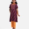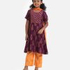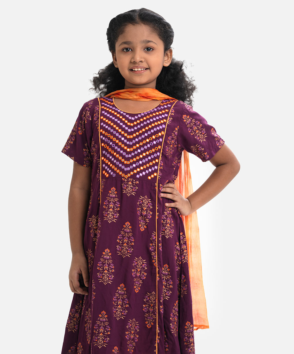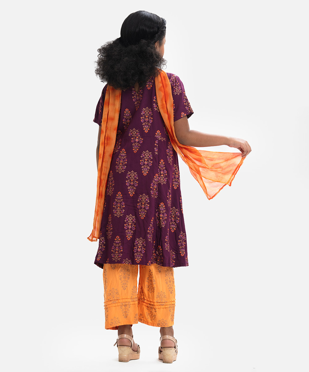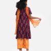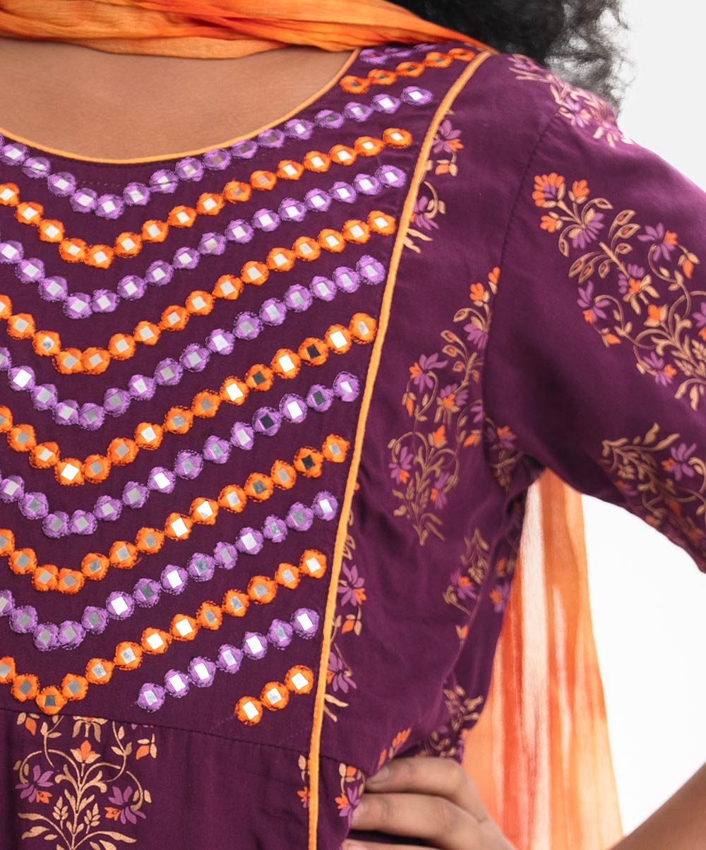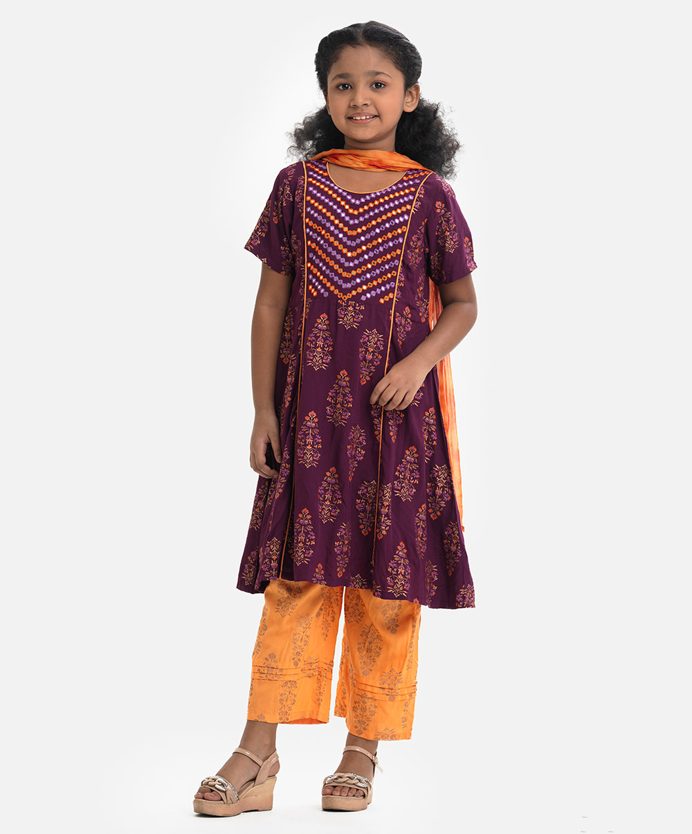 Round neck salwar kameez set in viscose fabric. Patterned, cap-sleeved and karchupi at the front. Paired with an elasticated waist palazzo.