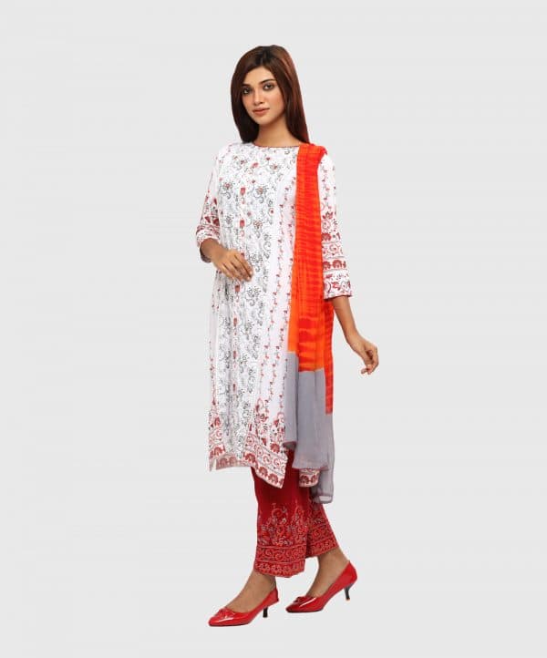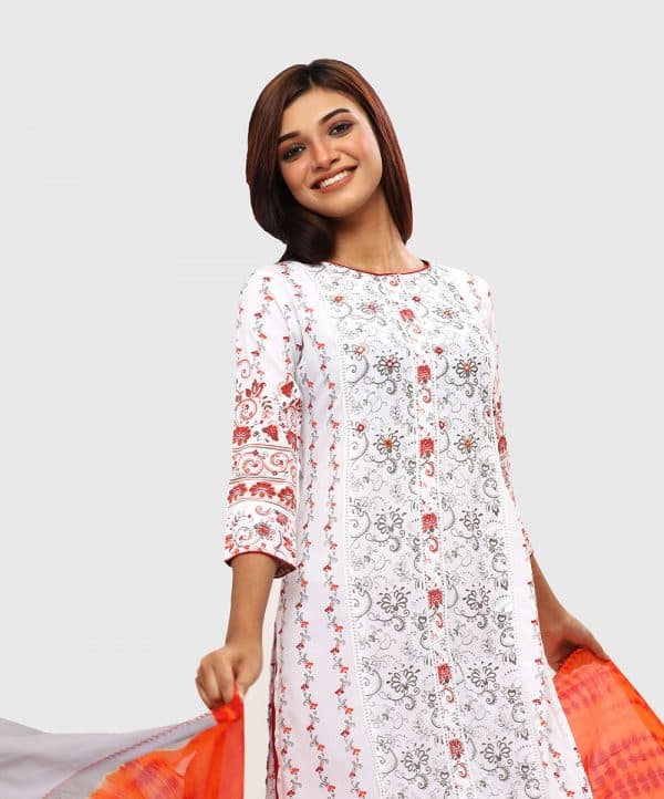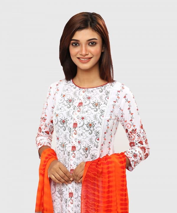 White A-line Salwar Kameez set in viscose fabric. All over floral-vine printed,3-quarter sleeves, trendy lace attached on front, round neck and contrast piping hemline on kameez. Complemented with printed viscose Palazzo and tie-dye chiffon Dupatta.