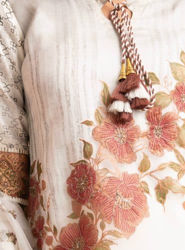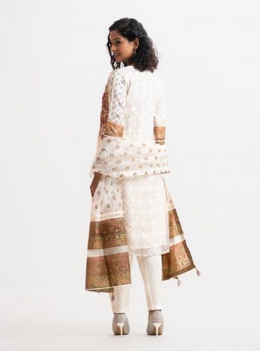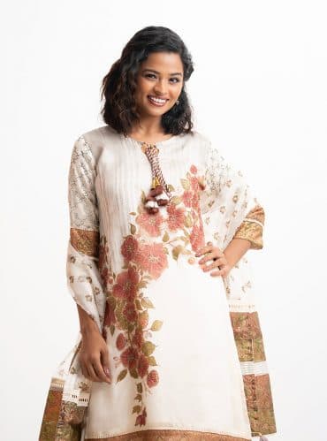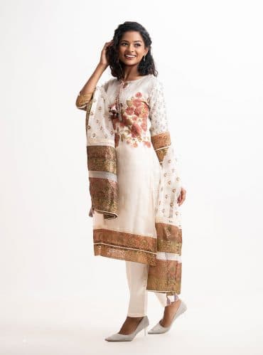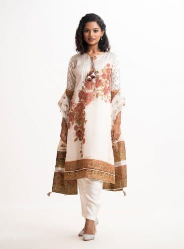 White A-line Salwar Kameez set in viscose fabric. All over floral-vine printed,3-quarter sleeves, trendy lace attached on front, round neck and contrast piping hemline on kameez. Complemented with printed viscose Palazzo and tie-dye chiffon Dupatta.
