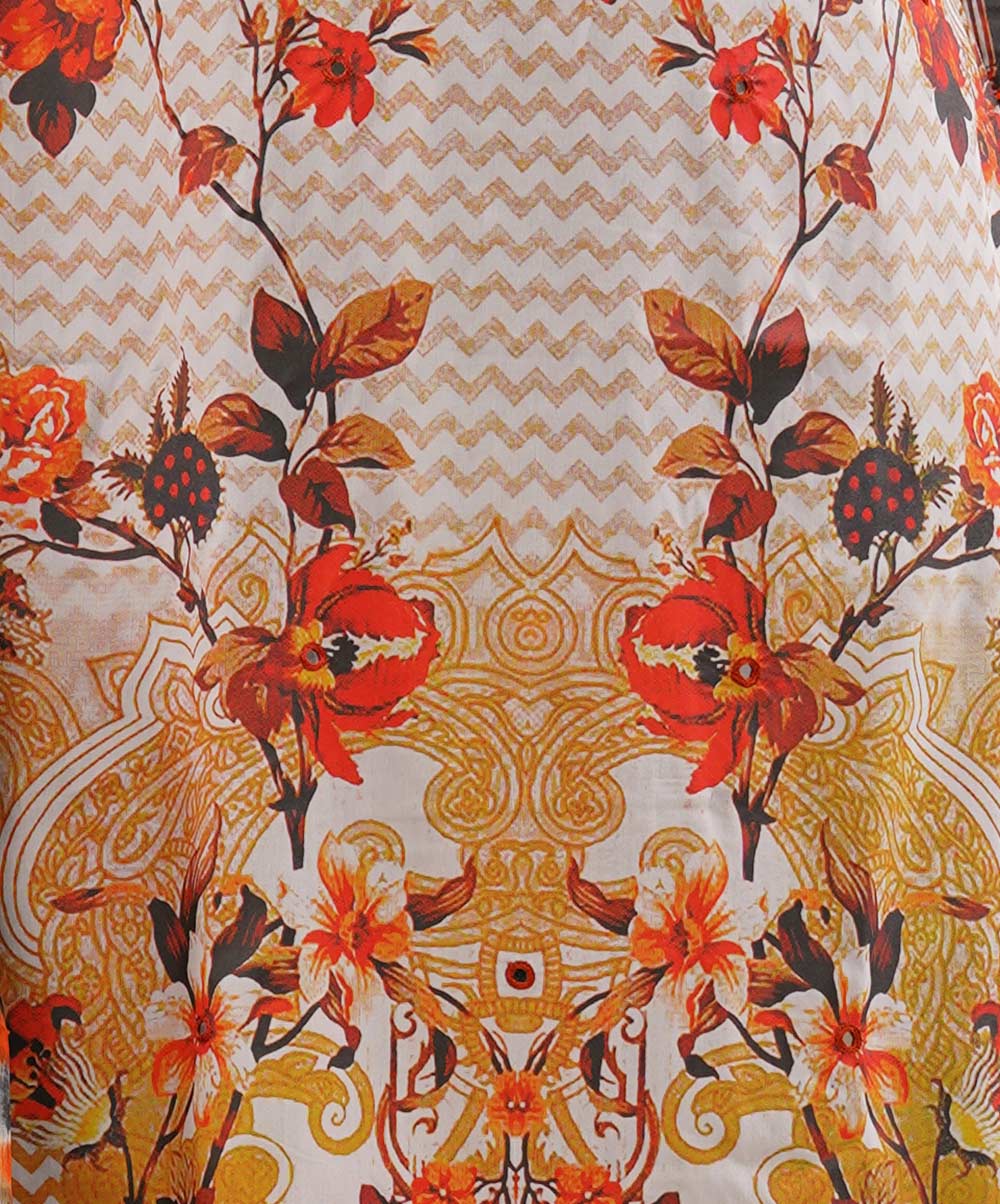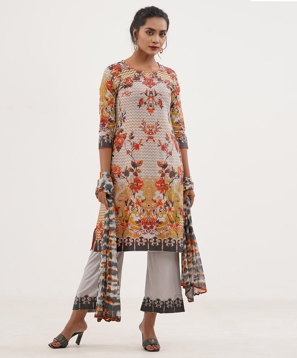 Grey A-line cut printed salwar kameez set in soft viscose fabric. The kameez comes with karchupi glass work and the palazzo with printed border in hem. Tie dye chiffon dupatta.