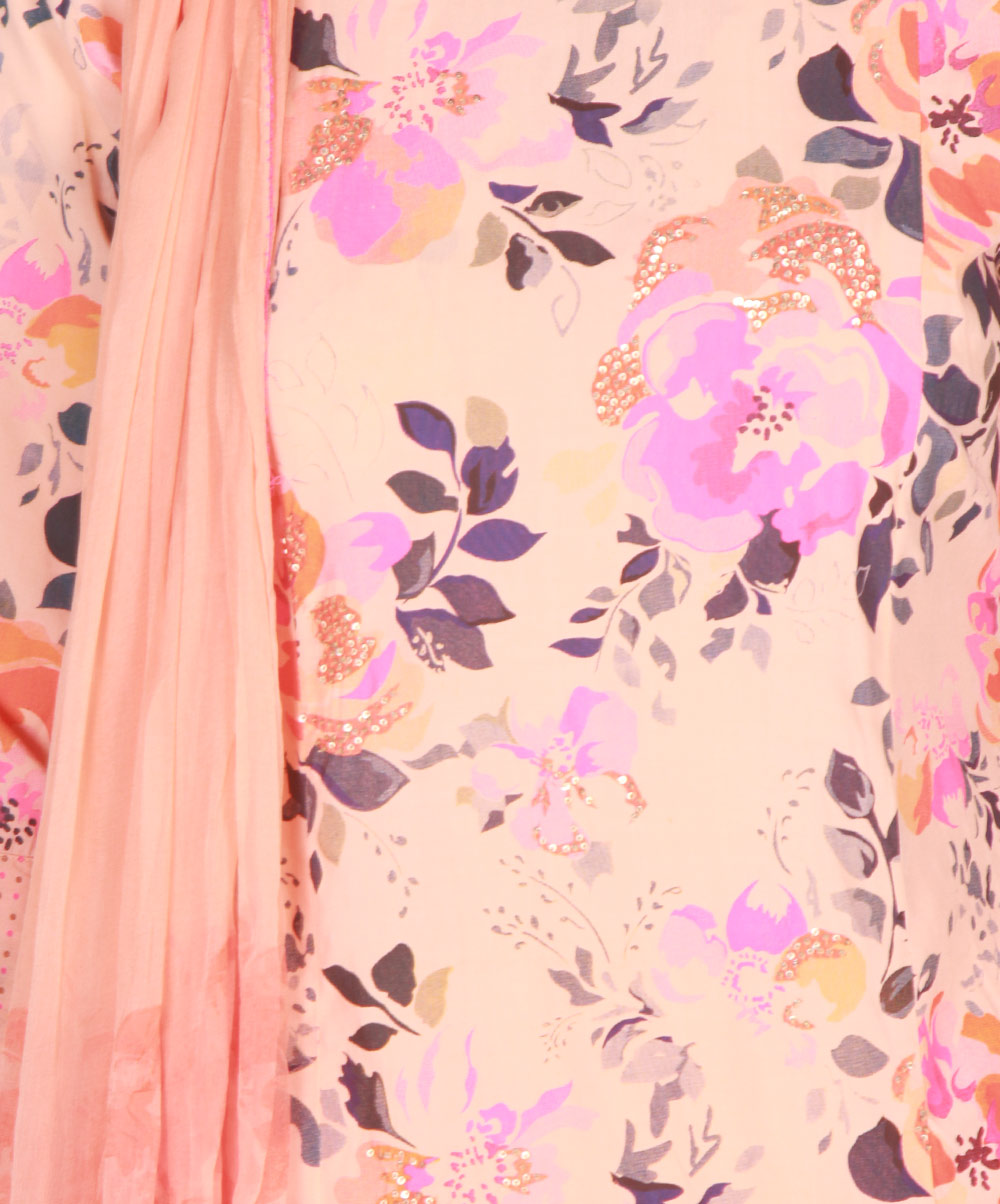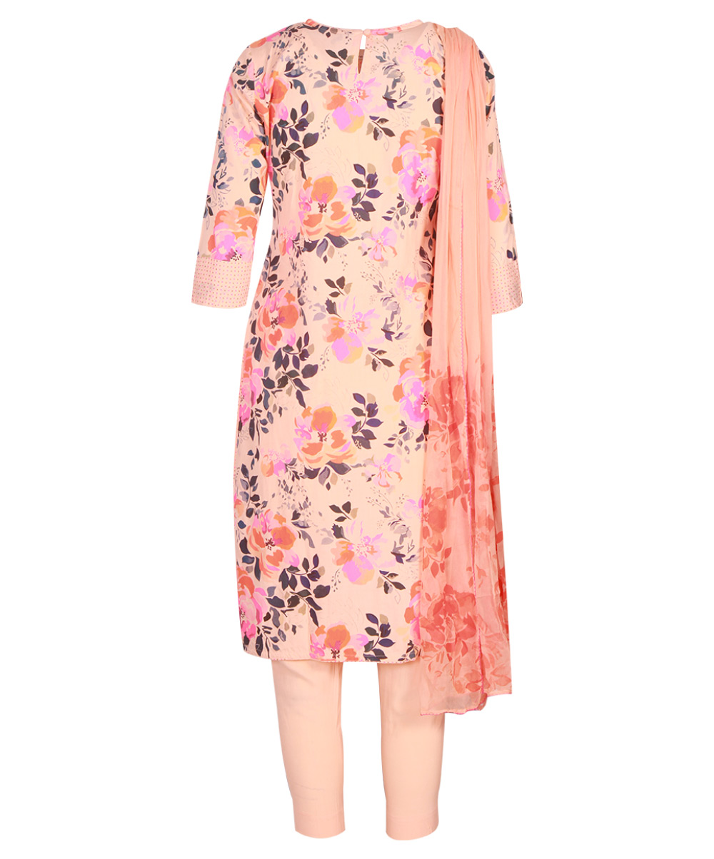 Orange printed classic viscose kameez with karchupi in front. Matching pant cut salwar with printed dupatta.