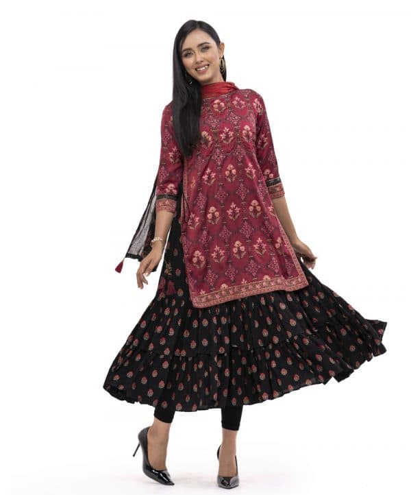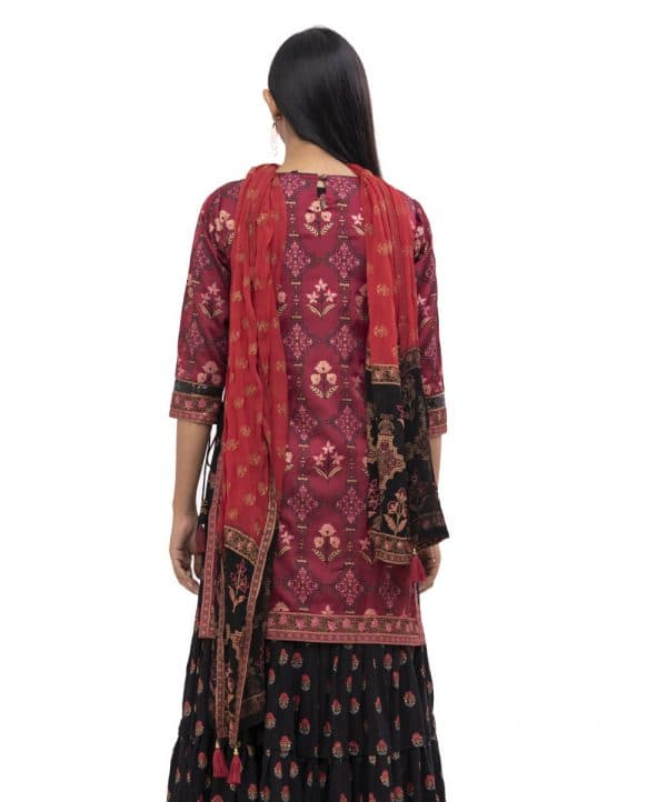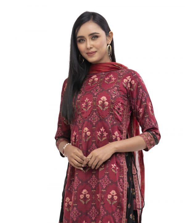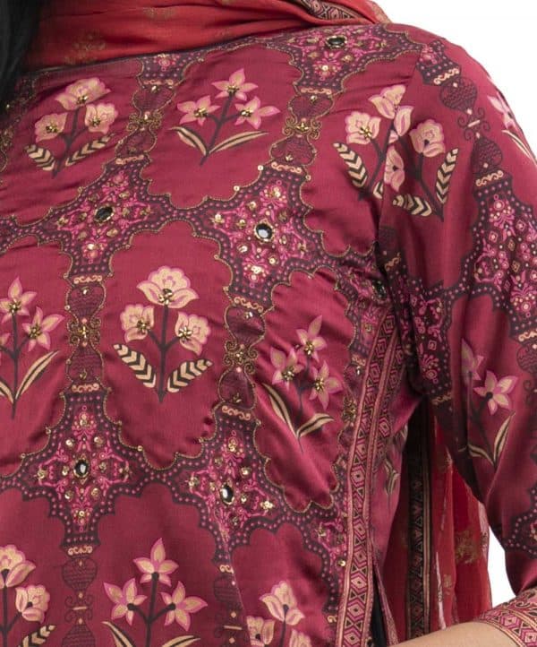 Maroon Kameez suit in Crepe layer with Viscose inner and Chiffon dupatta. All-over floral printed with karchupi on the front. Designed with cords on side slits and 3-quarter sleeves.