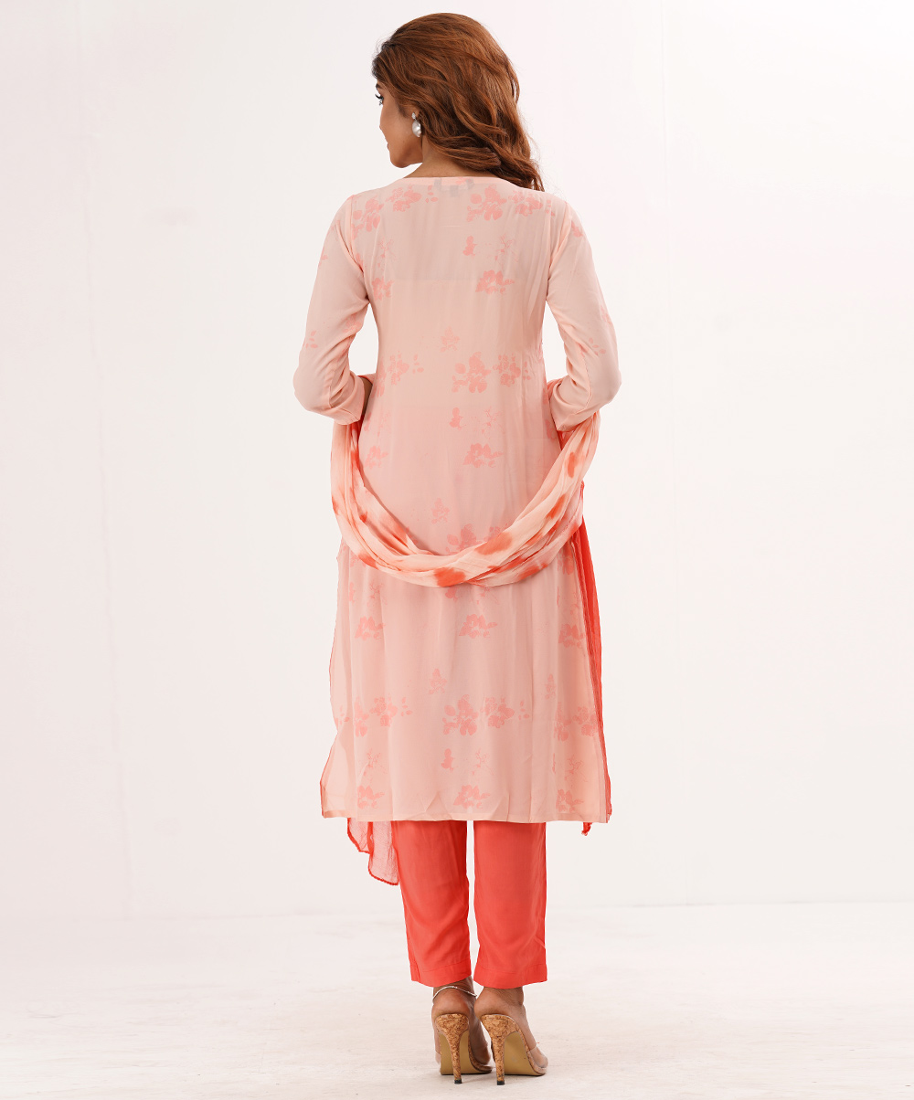 Orange printed georgette kameez with karchupi in front. Embellished with viscose cigarette pant and tie dyed dupatta.