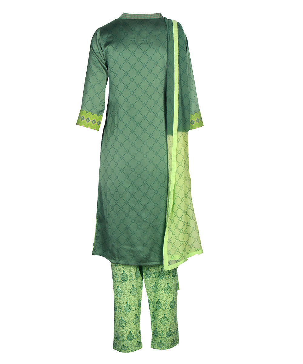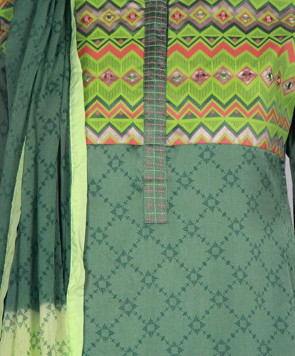 Green classic printed kameez crafted in crepe silk, decorated with embroidered patchwork in front. Pant cut printed viscose salwar and deep dyed dupatta with borders.