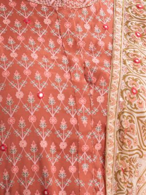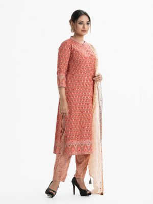 Orange and Red all-over printed Salwar Kameez in Viscose fabric. The Kameez is designed with a round neck and three-quarter sleeves. Embellished with karchupi at the front. Complemented by palazzo pants and a chiffon dupatta.