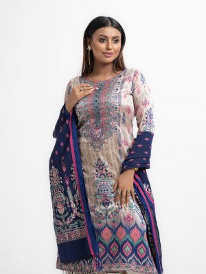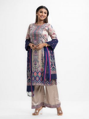 Gray all-over printed Salwar Kameez in Viscose fabric. The Kameez is designed with a mandarin neck and three-quarter sleeves. Paired with palazzo pants with beautiful patches on borderline. Complemented with a printed half-silk dupatta.