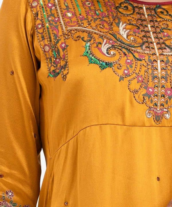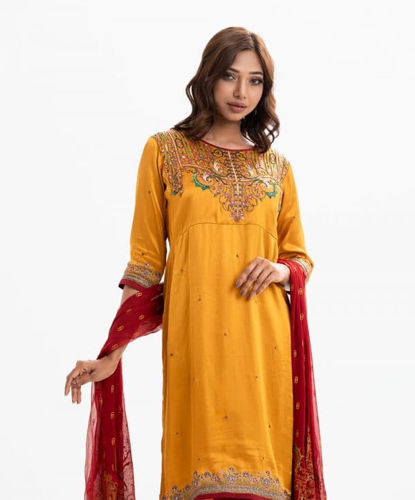 Women’s exclusive straight salwar kameez from Nargisus by le reve in silk & viscose blended fabric. Round neck, three-quarter sleeved and karchupi at the front. Complemented with crepe palazzo pant and muslin dupatta.