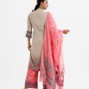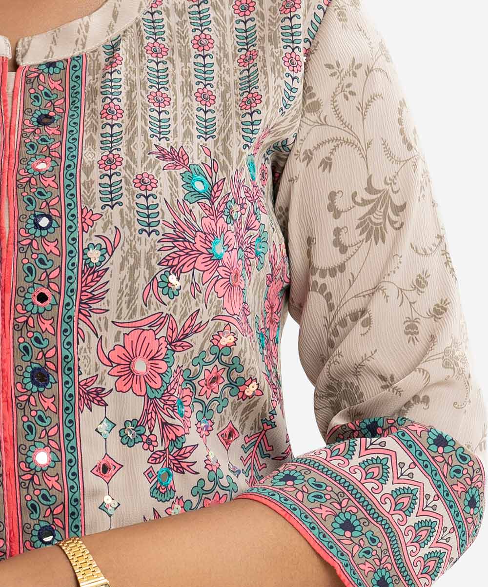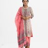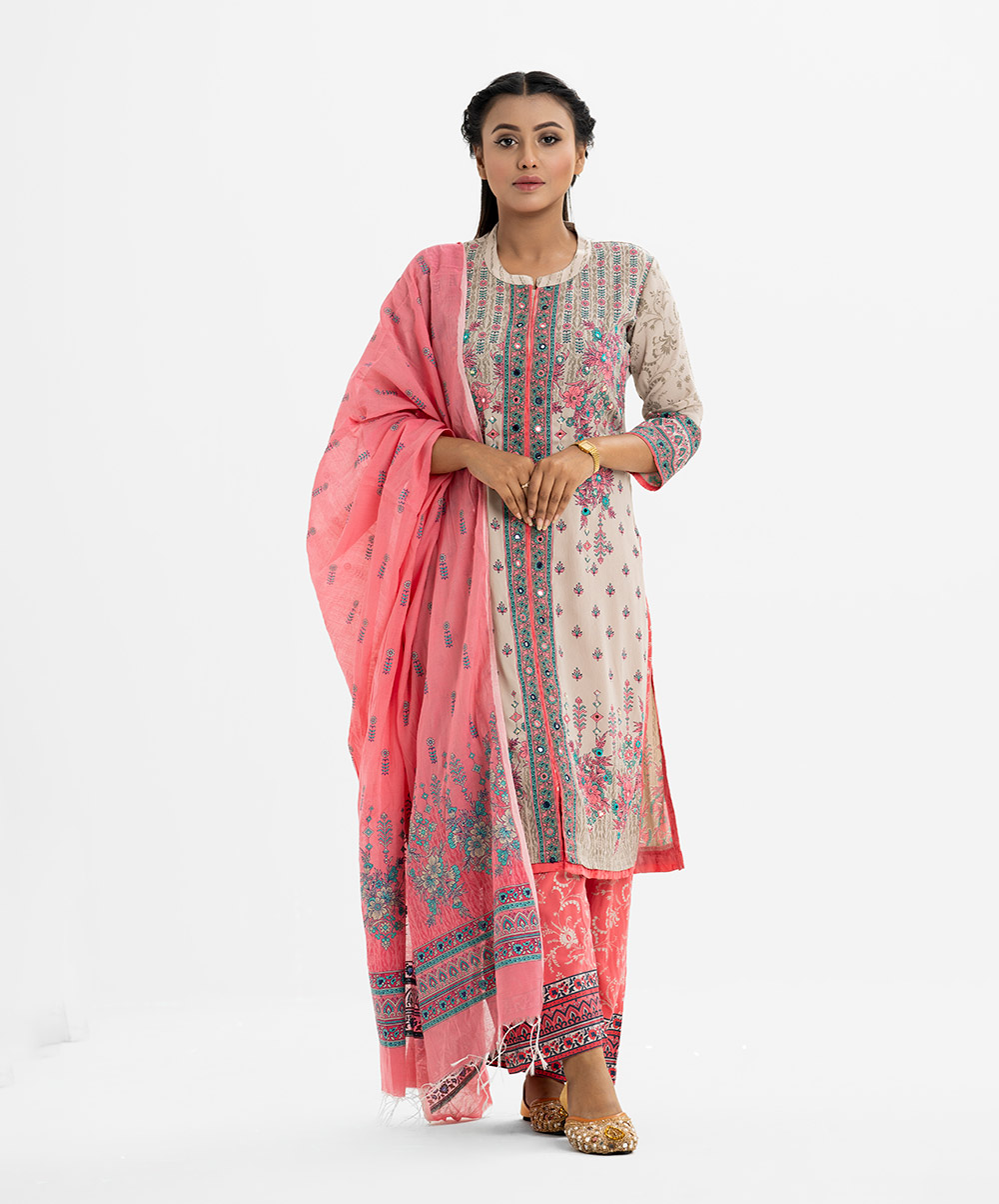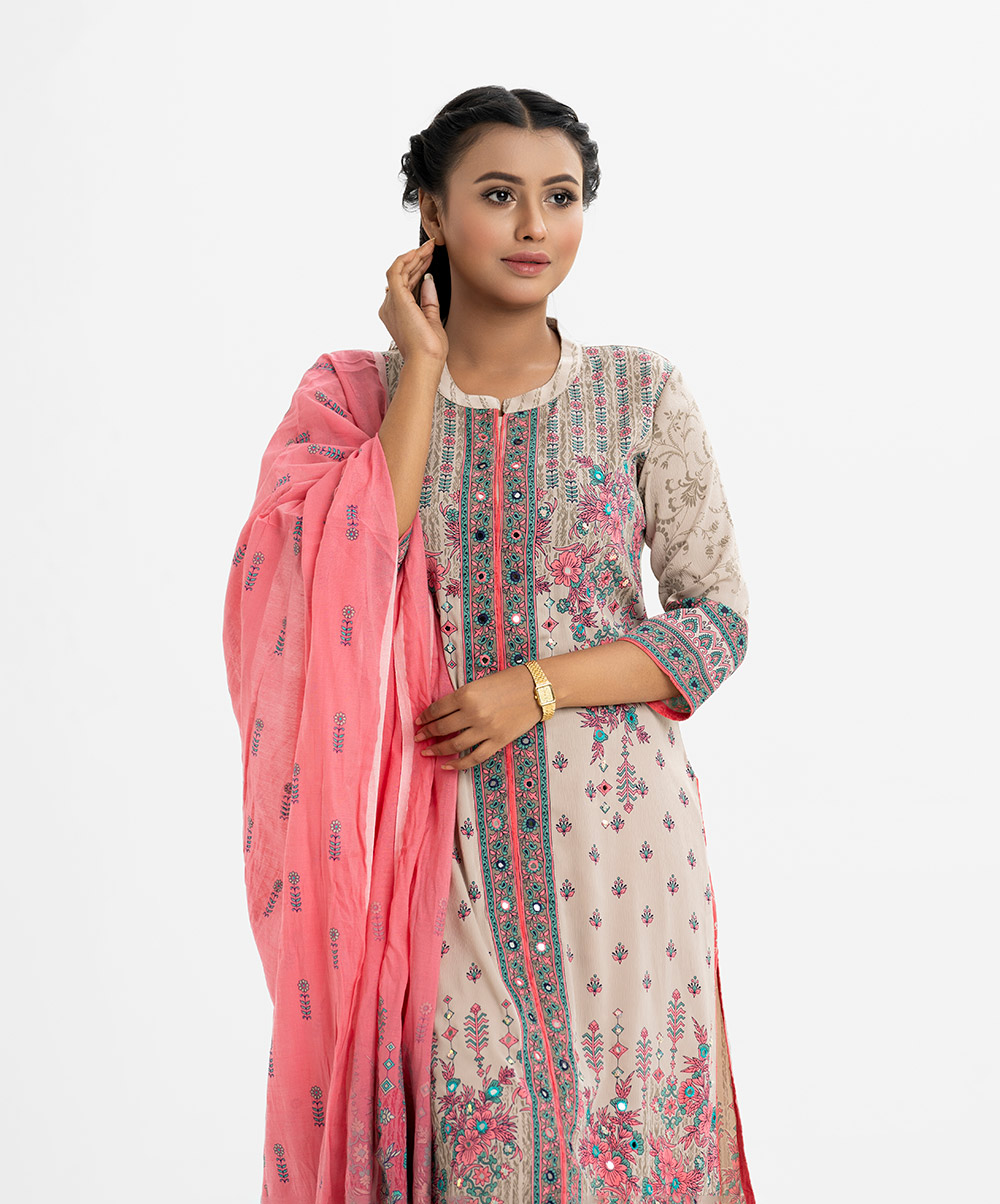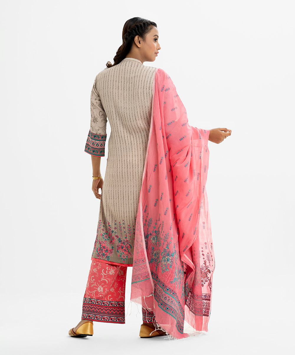Women’s printed straight salwar kameez in joom fabric. Round neck, three-quarter sleeves and karchupi at the front. Paired with a viscose palazzo pant and a half-silk dupatta.