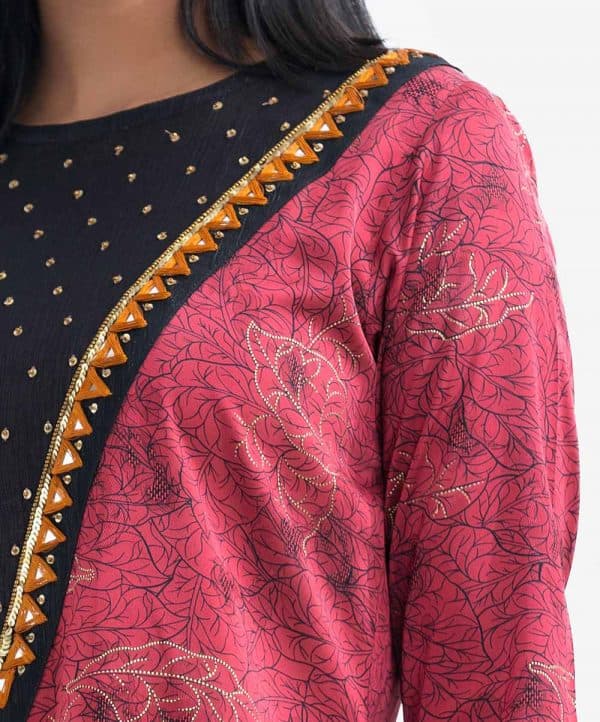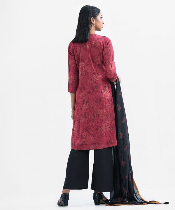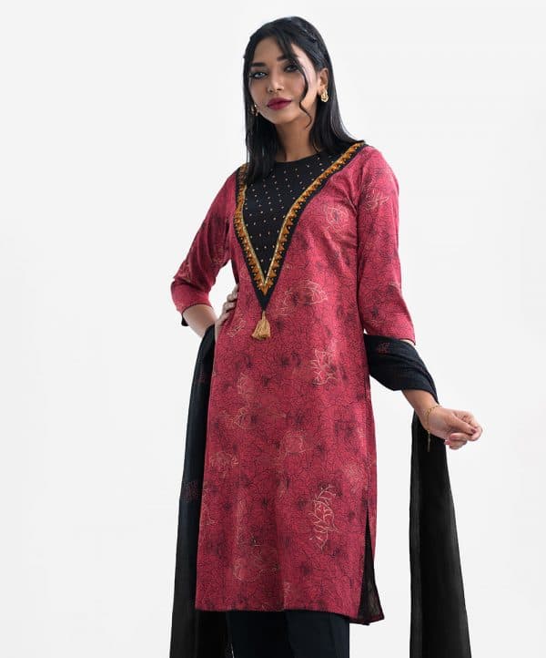Women’s exclusive salwar kameez from Nargisus by Le Reve in jacquard fabric. Round neck, three-quarter sleeved and karchupi at the front with tassel. Complemented with crepe palazzo and georgette dupatta.