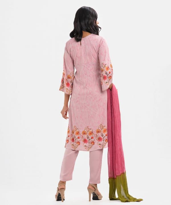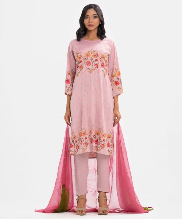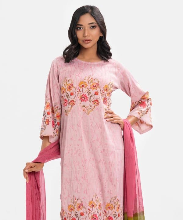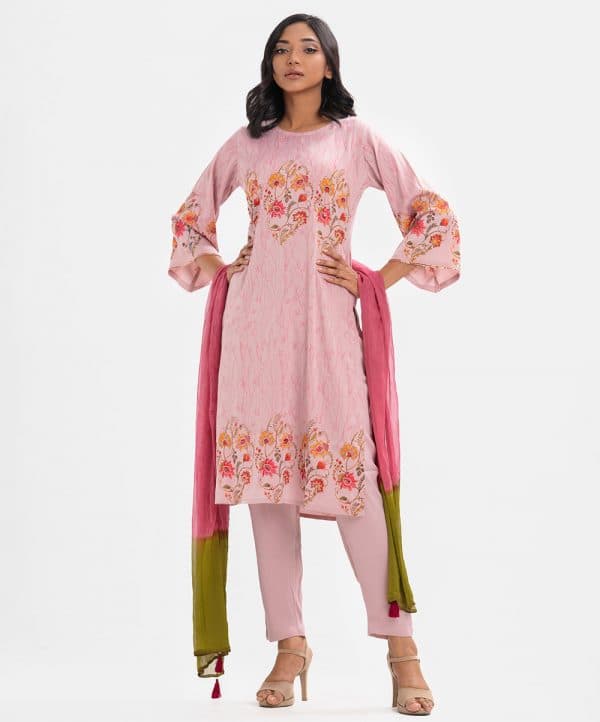 Women’s floral printed salwar kameez in joom fabric. Three-quarter sleeves, round neck and karchupi at front. Chiffon dupatta with pant-style pajamas.