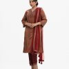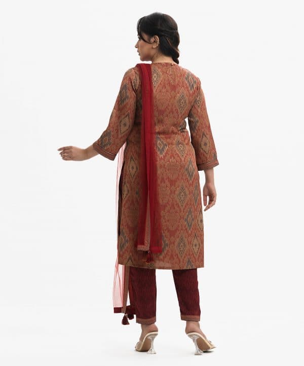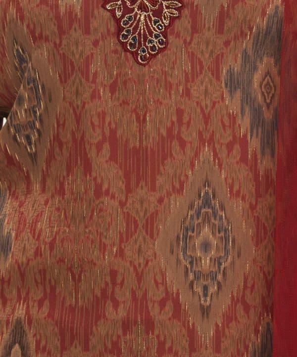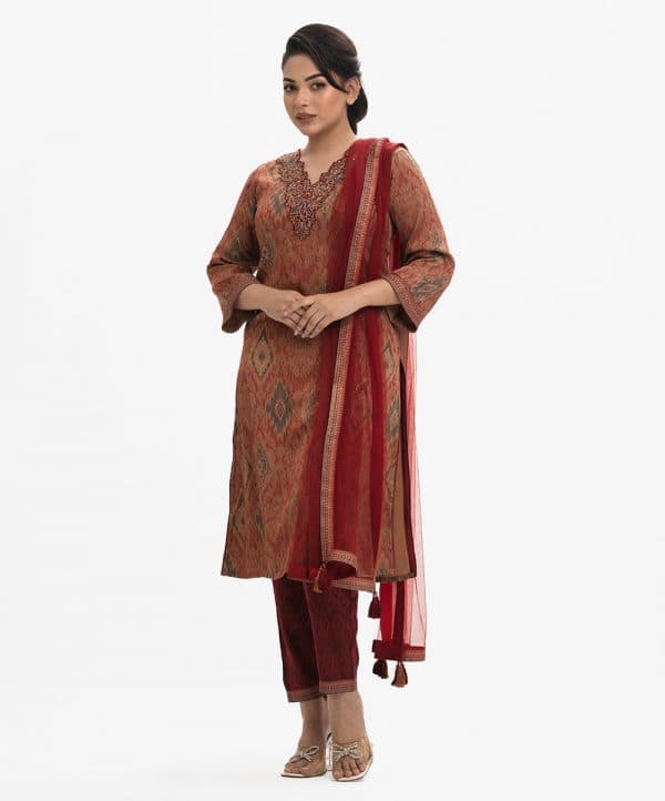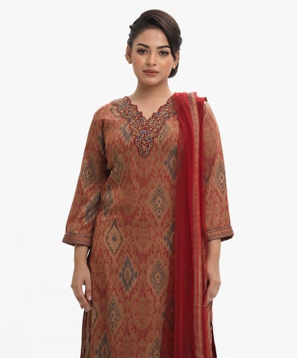 Women’s exclusive salwar kameez in Nargisus by Le Reve. Jacquard fabric kameez, V-cutwork patch neck with heavy karchupi, patch with karchupi at bell sleeves cuff. With a shimmer dupatta & pant-style pajama.