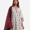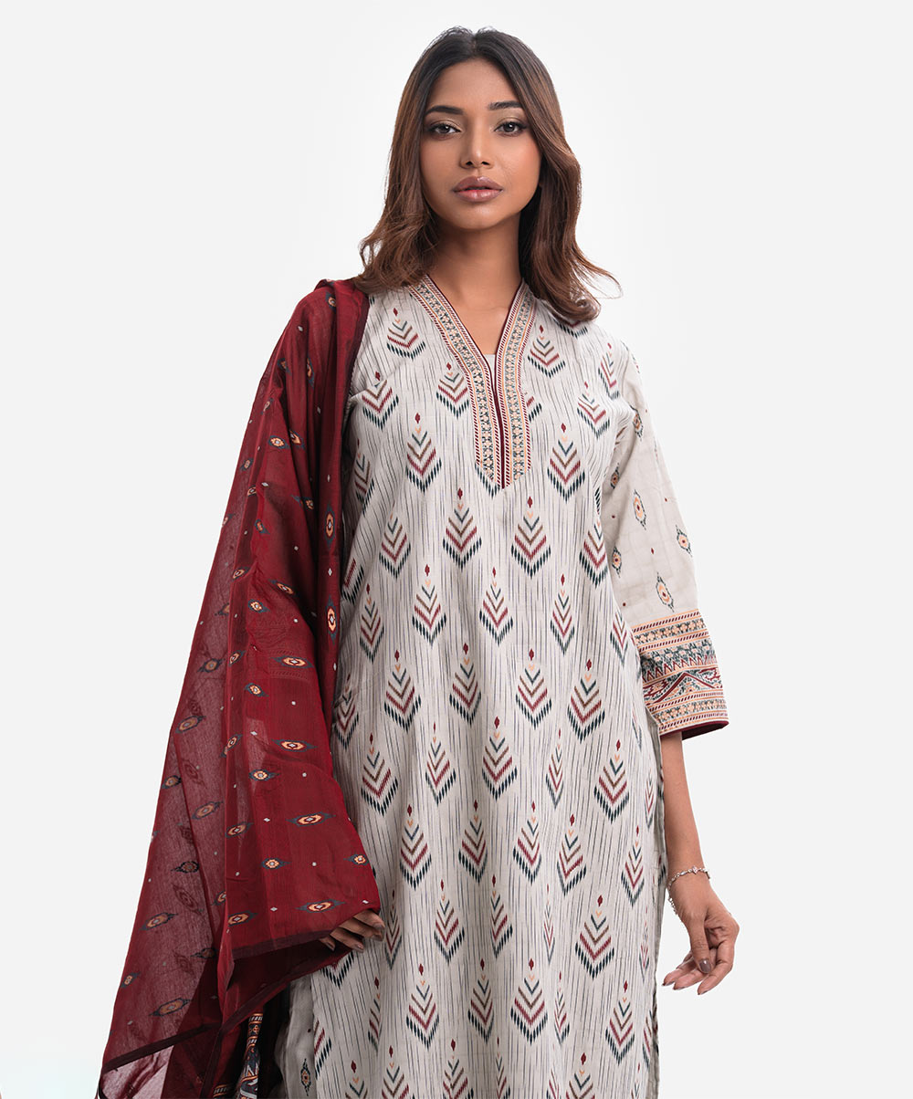 Women’s printed salwar kameez in Jacquard cotton fabric. V-neck, three-quarter sleeves and printed detail kameez. Comes with a half-silk dupatta and palazzo pants.