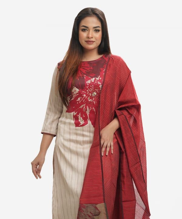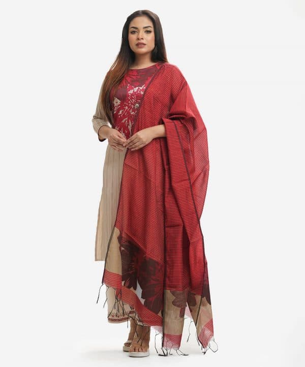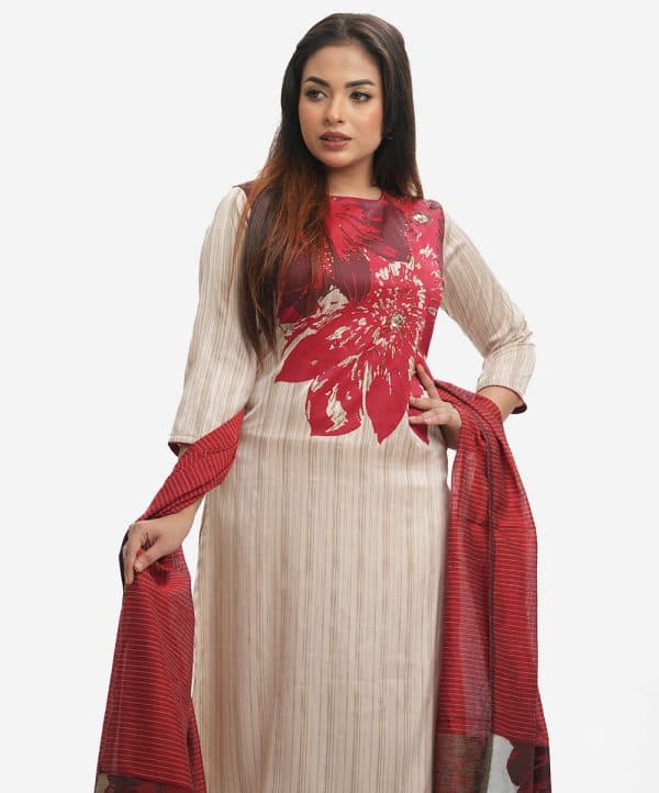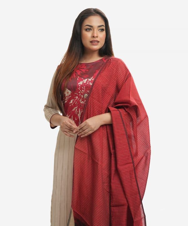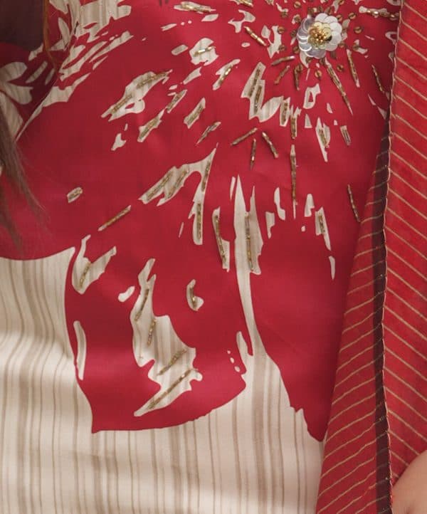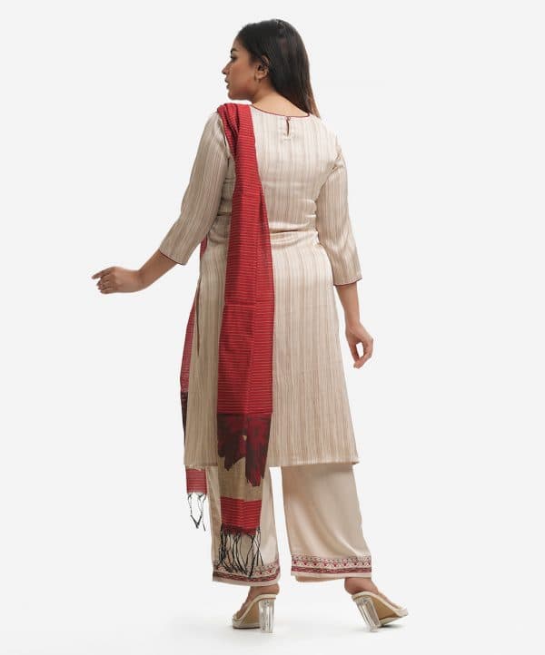 Round neck kameez with three-quarter sleeves in satin-georgette fabric.Karchupi at the front. Complemented with a palazzo pant and a half-silk dupatta.