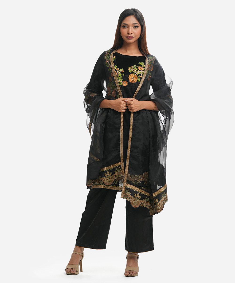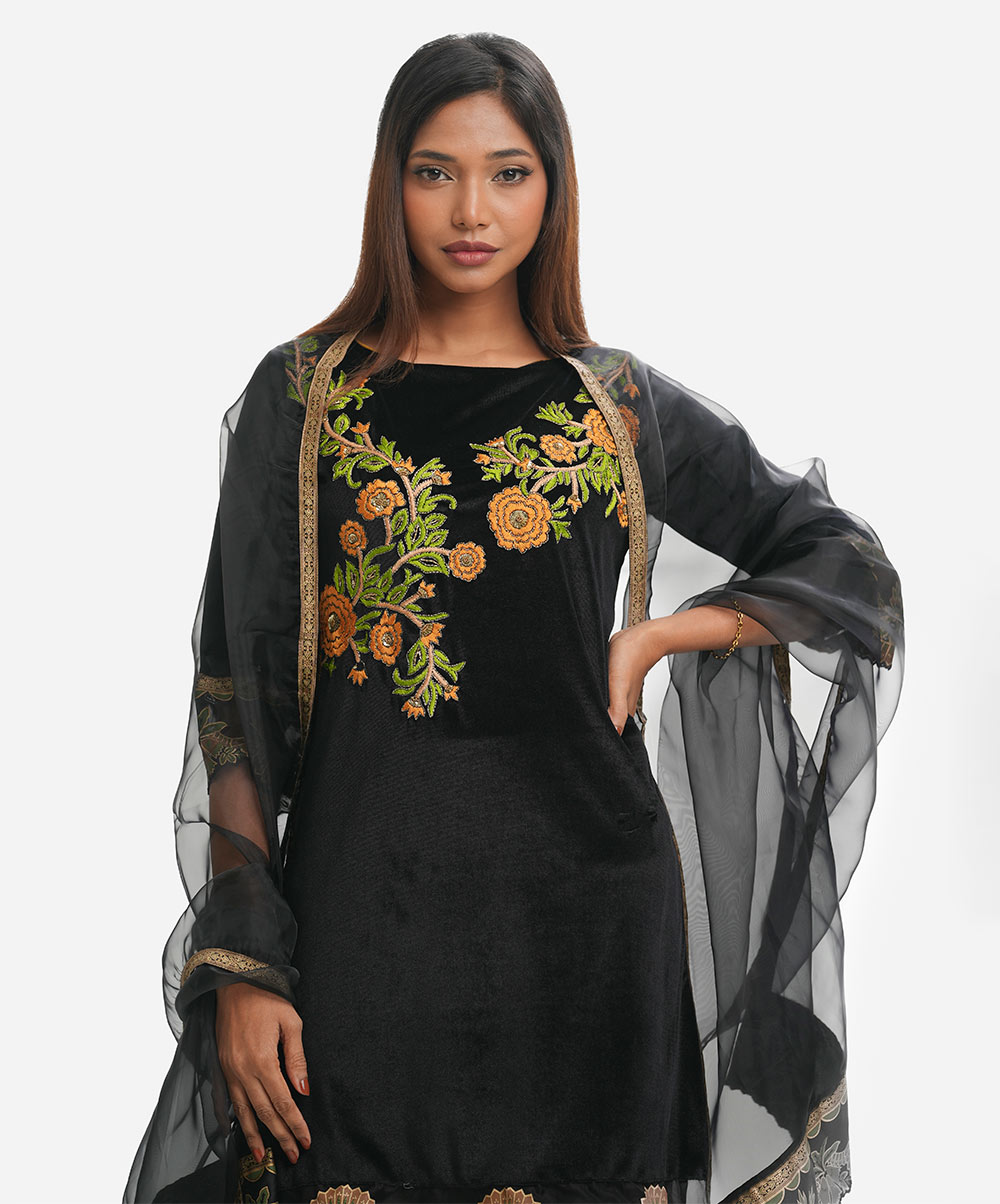 Women’s exclusive salwar kameez in Nargisus by Le Reve. Velvet fabric front part kameez with georgette lining. Boat neck, three-quarter sleeves with cutwork muslin cuff & hemline and heavy karchupi, embroidery at the front of the kameez. With a muslin dupatta & textured georgette palazzo pants.