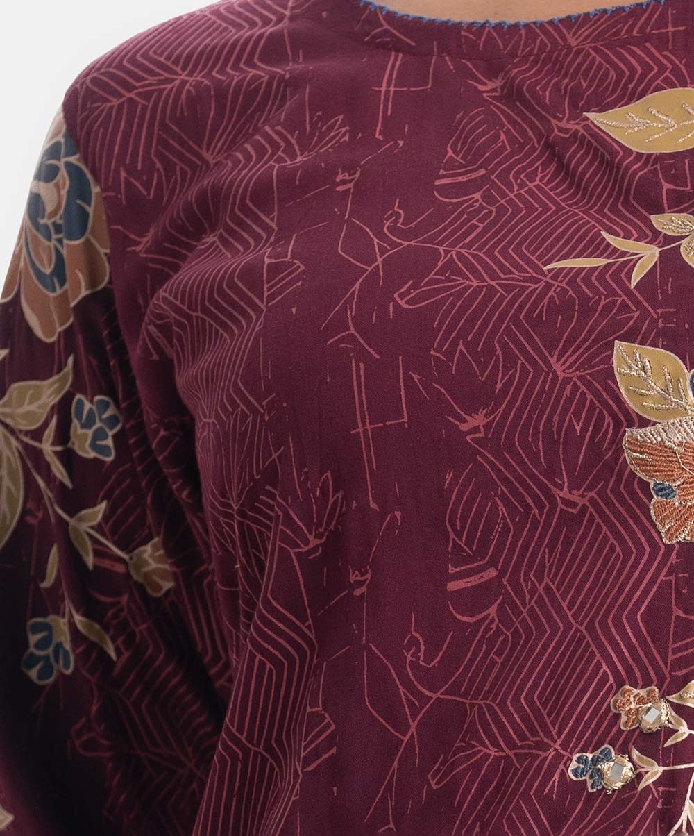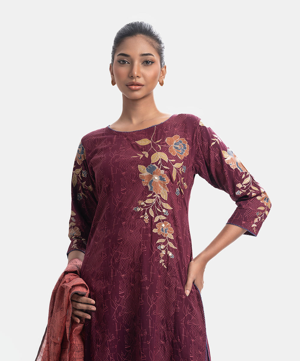 Women’s printed salwar kameez in viscose fabric. Round neck, three-quarter sleeves and embroidery at front of kameez. Palazzo pants and half-silk dupatta.