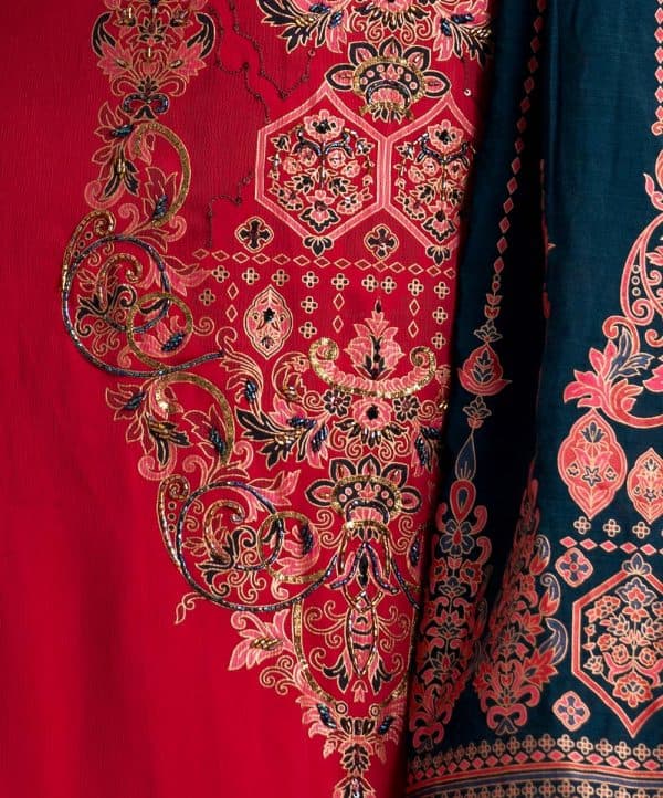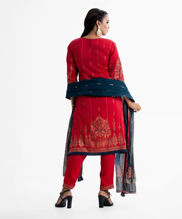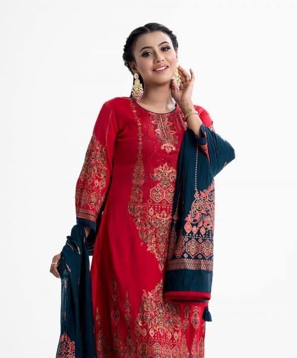 Women’s ethnic printed salwar kameez in joom fabric. Stand collar, three-quarter sleeves and karchupi at the front of kameez. Half-silk dupatta with pant pajamas.