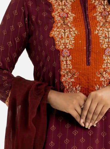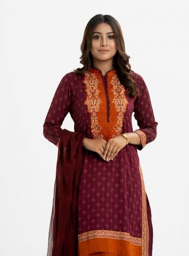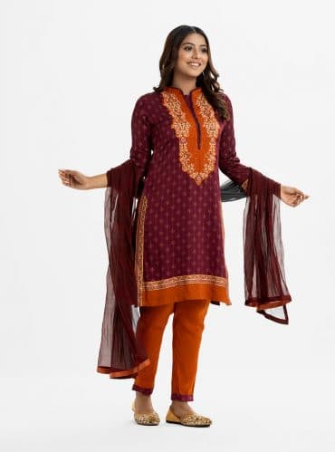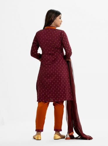 Women’s ethnic printed salwar kameez in joom fabric. Stand collar, three-quarter sleeves and karchupi at the front of kameez. Half-silk dupatta with pant pajamas.