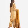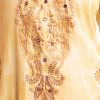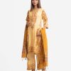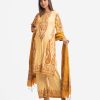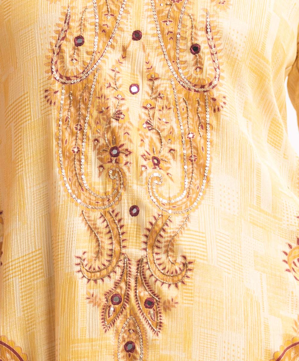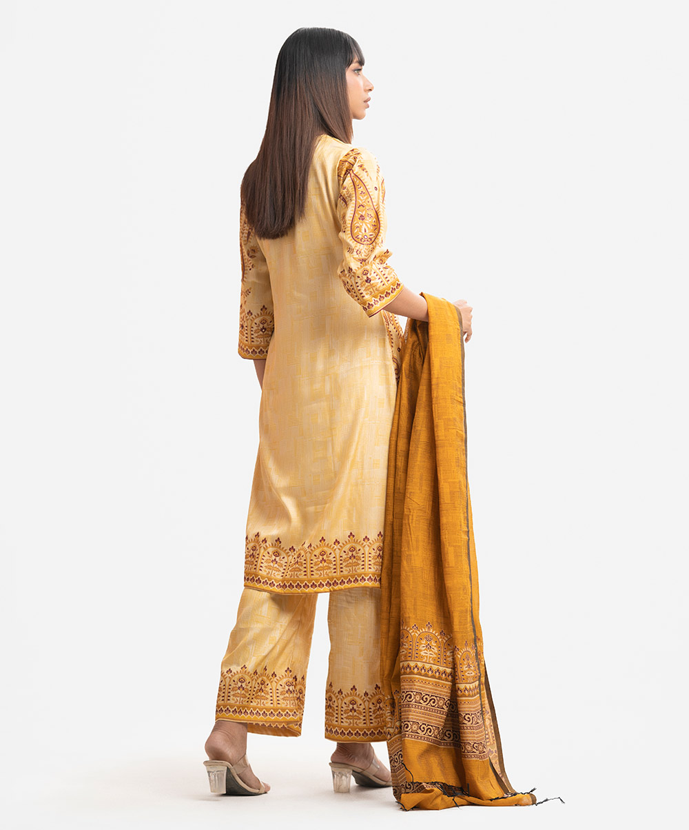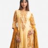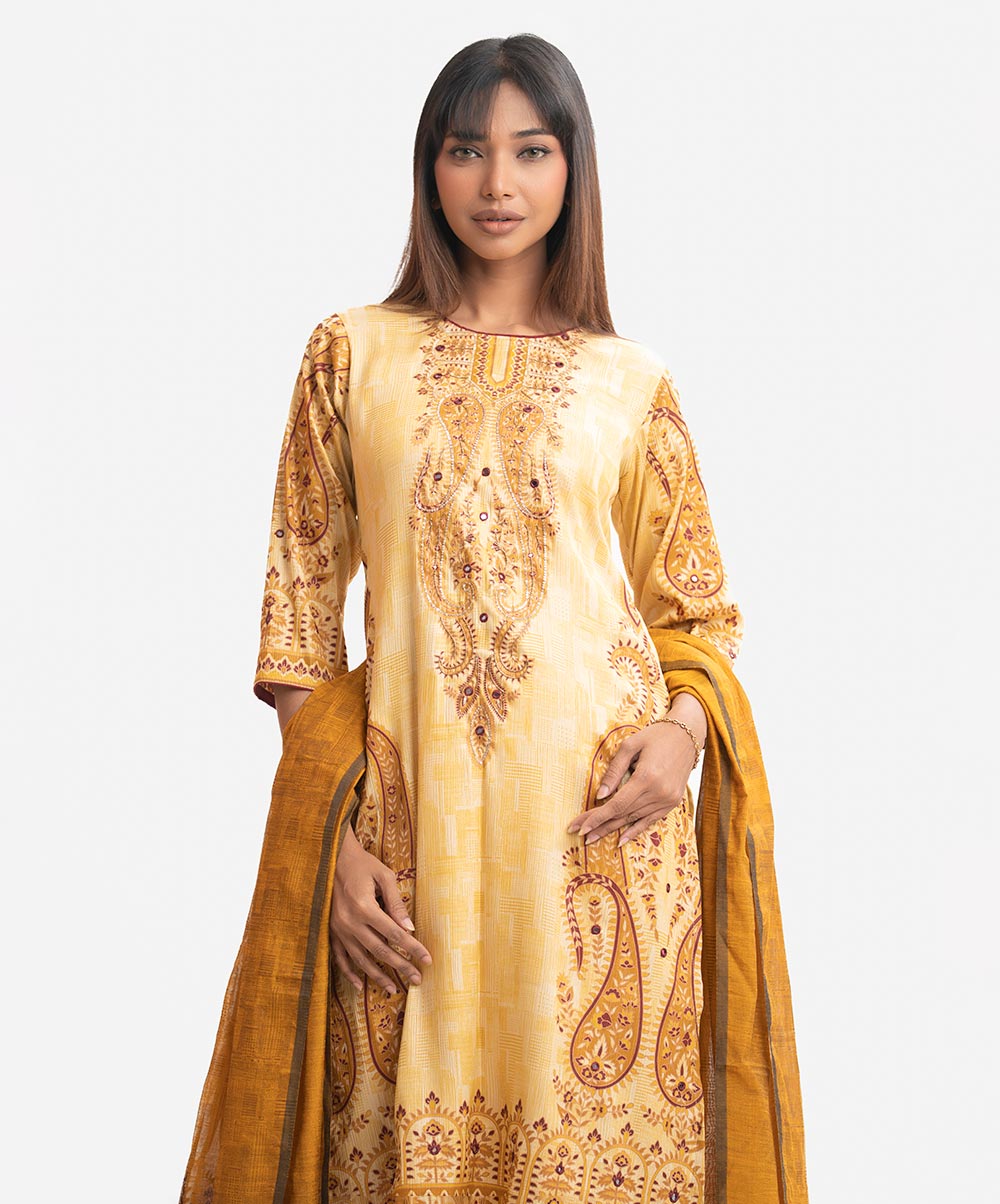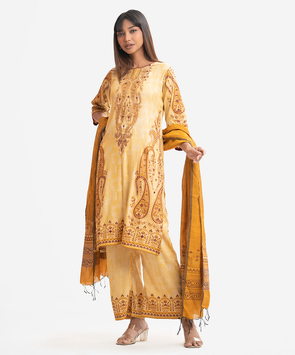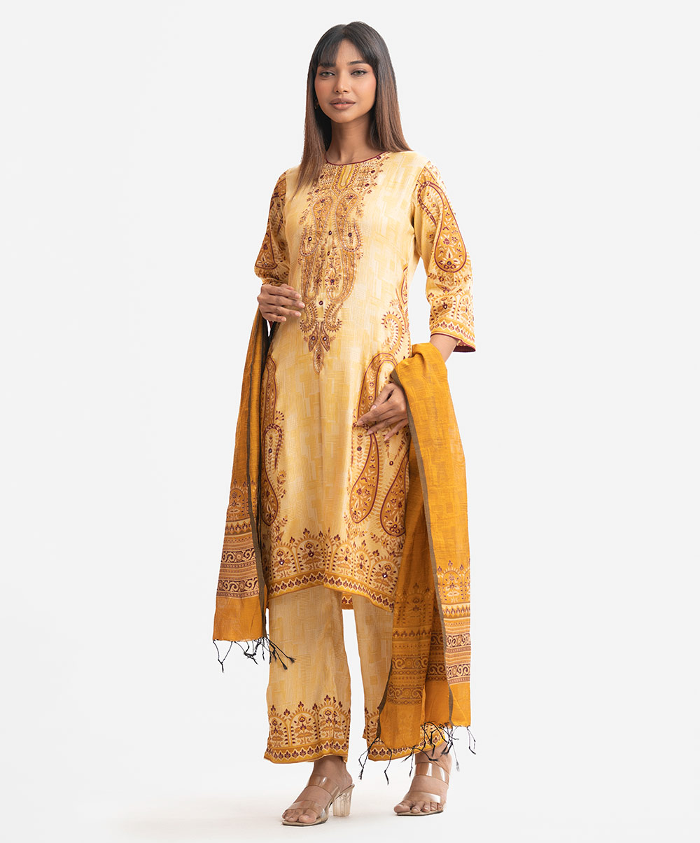 Women’s printed salwar kameez in joom fabric. Boat neck, three-quarter sleeves, embroidery & karchupi at the front of kameez. Half-silk dupatta with palazzo pants.