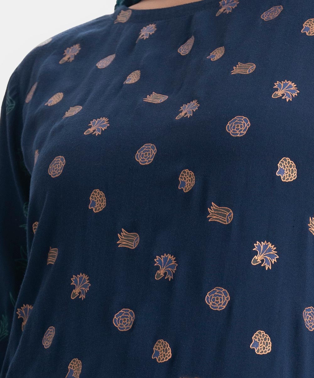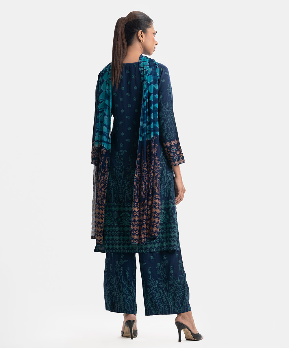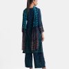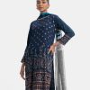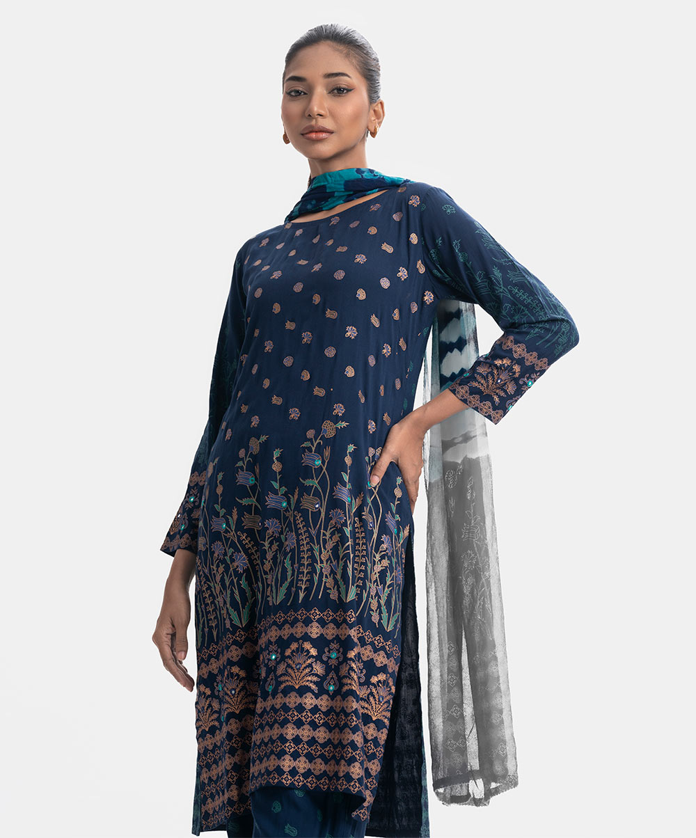 Round neck salwar kameez set in viscose fabric. Full-sleeved, karchupi detailed. Complemented with a tie-dye chiffon dupatta and palazzo pants.