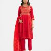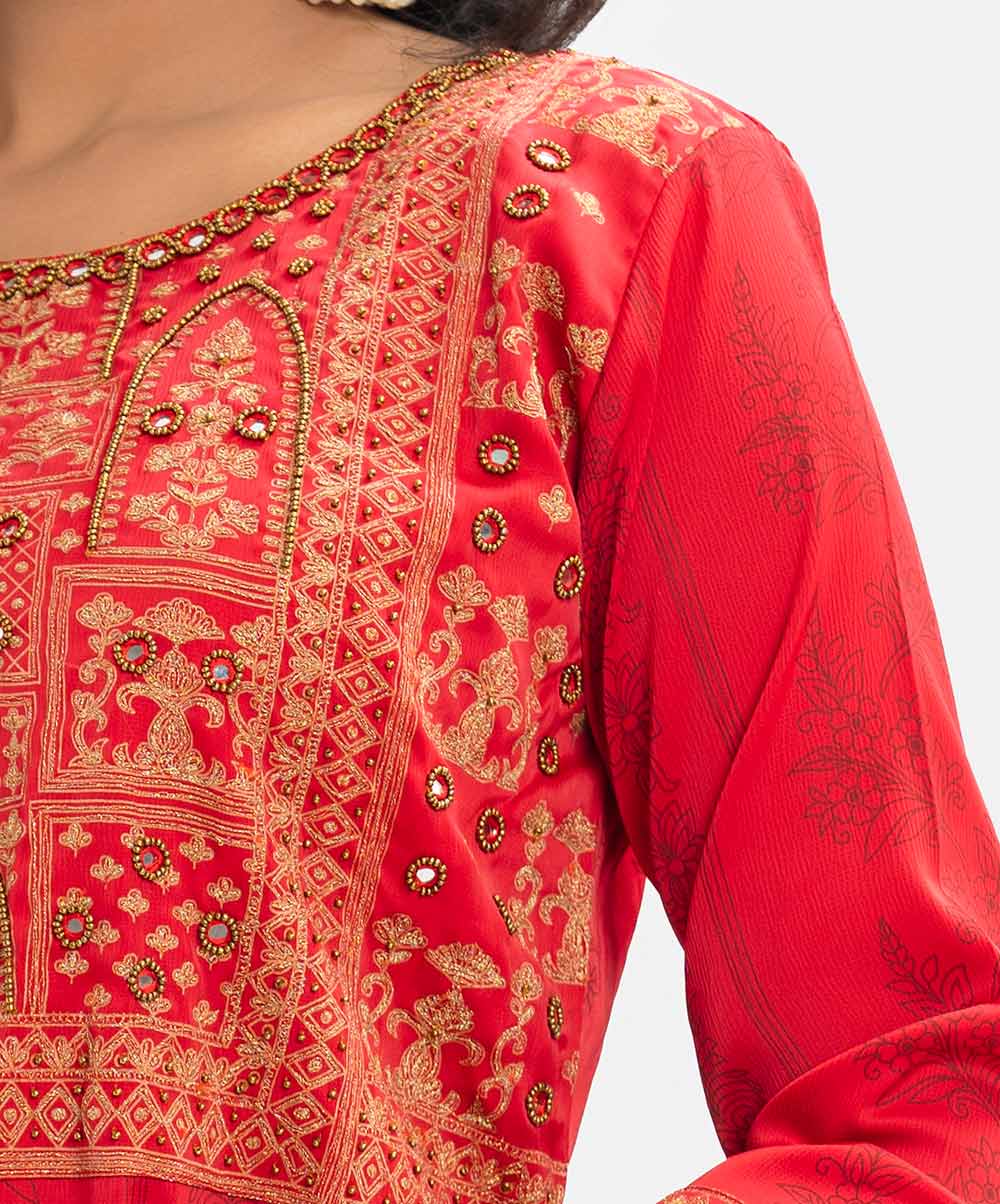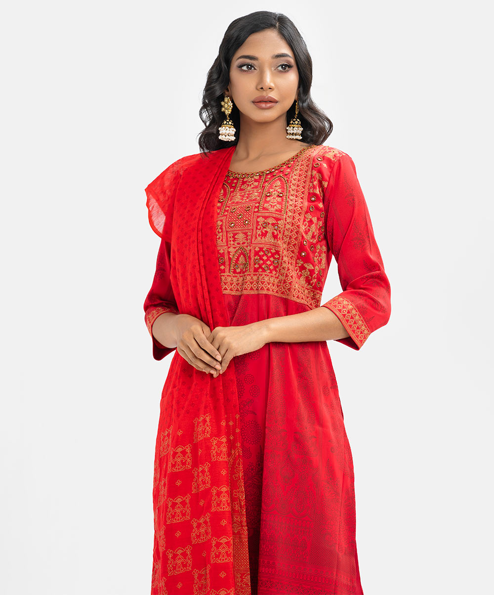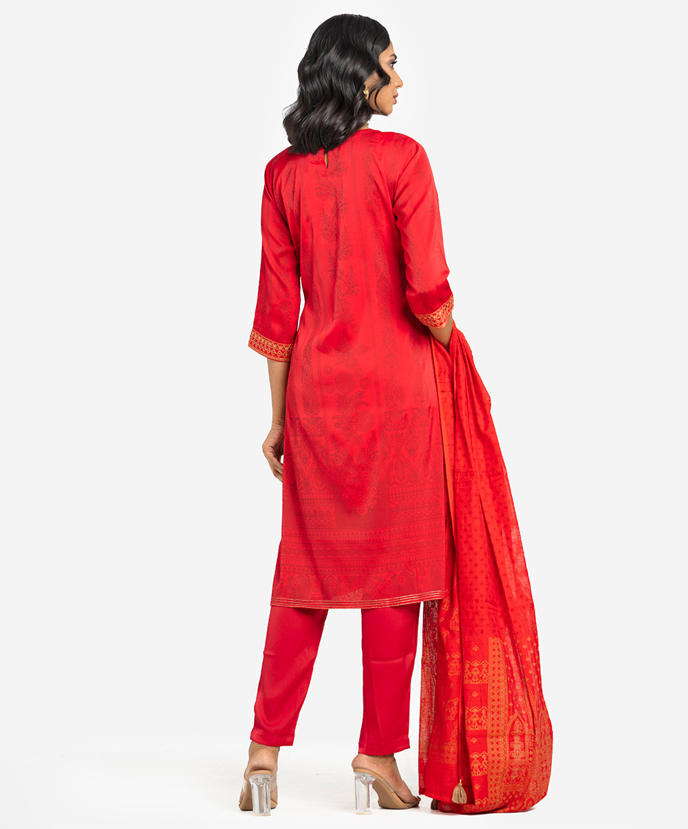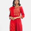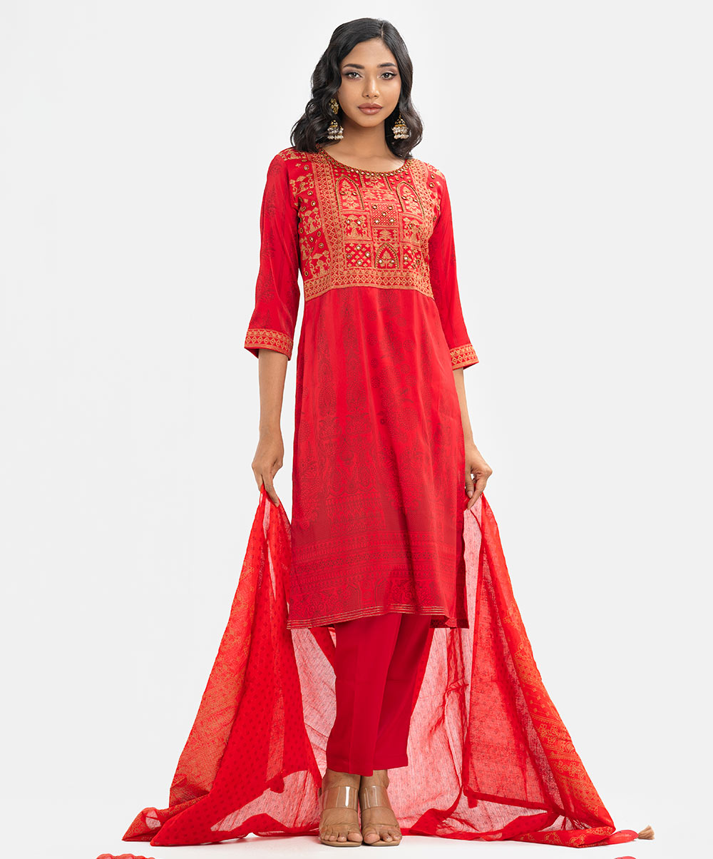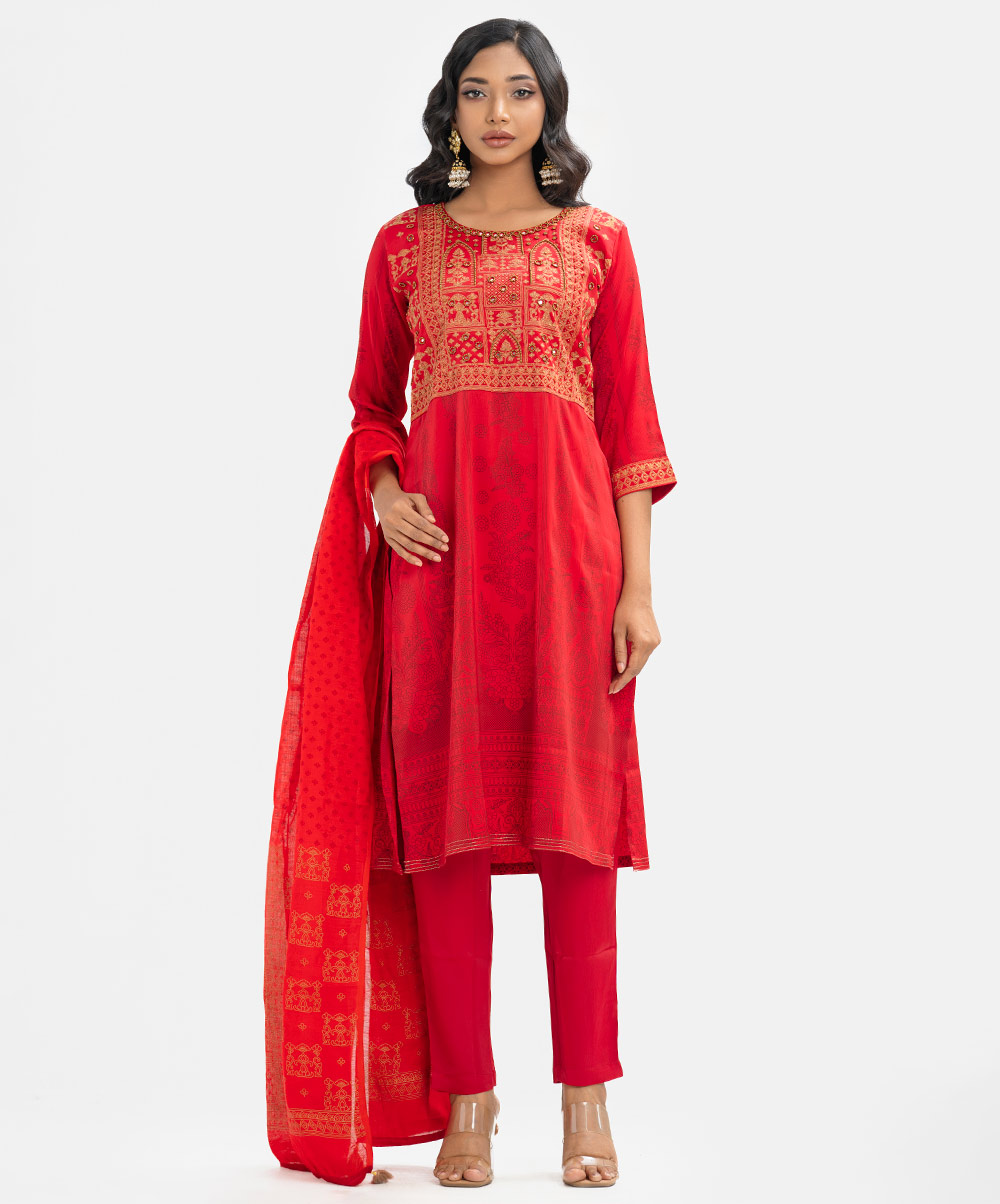 Women’s printed straight kameez in zoom fabric. Round neck, three-quarter sleeved. Karchupi at the front.