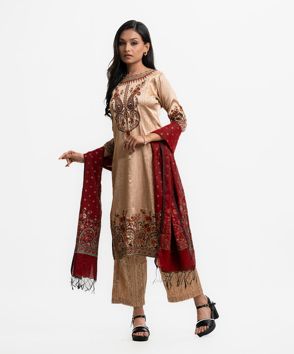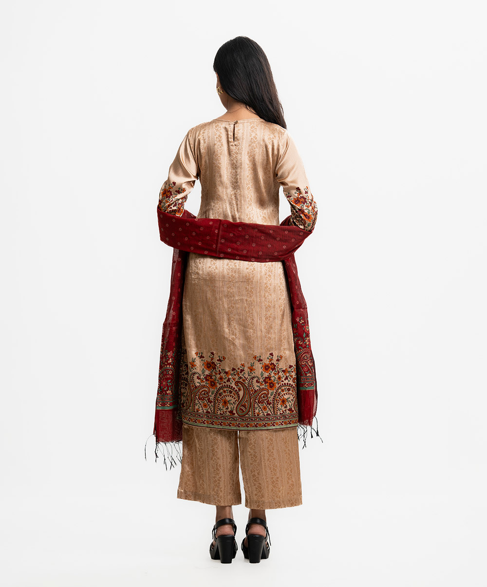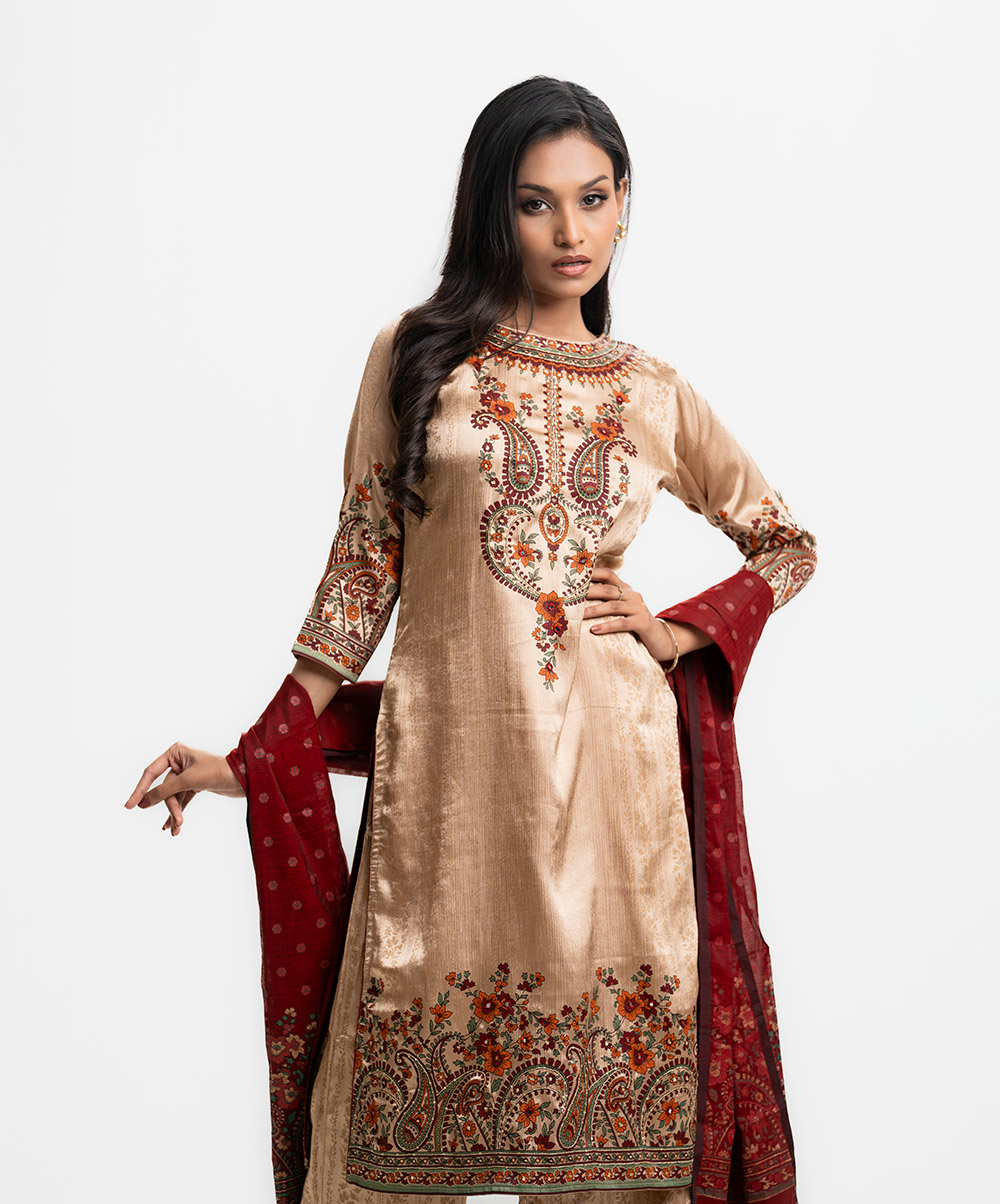 Round neck A-line salwar kameez in crepe georgette fabric. Three-quarter sleeves, Karchupi details. Complemented with a palazzo pant and half-silk dupatta.