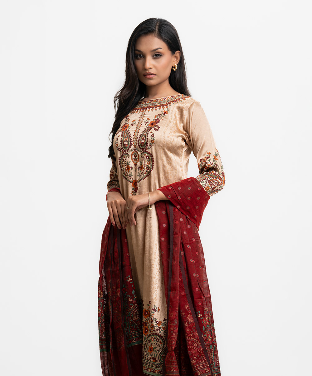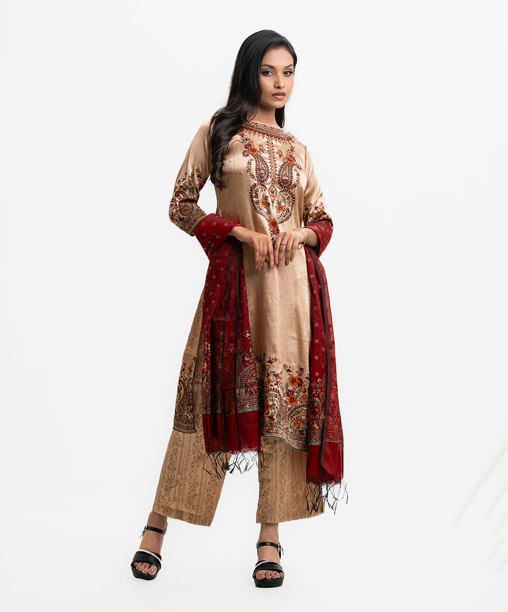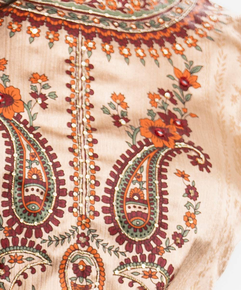 Round neck A-line salwar kameez in crepe georgette fabric. Three-quarter sleeves, Karchupi details. Complemented with a palazzo pant and half-silk dupatta.