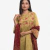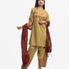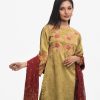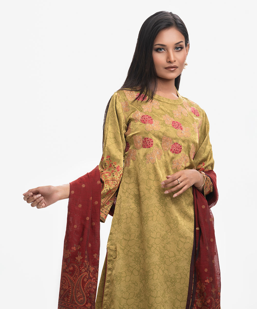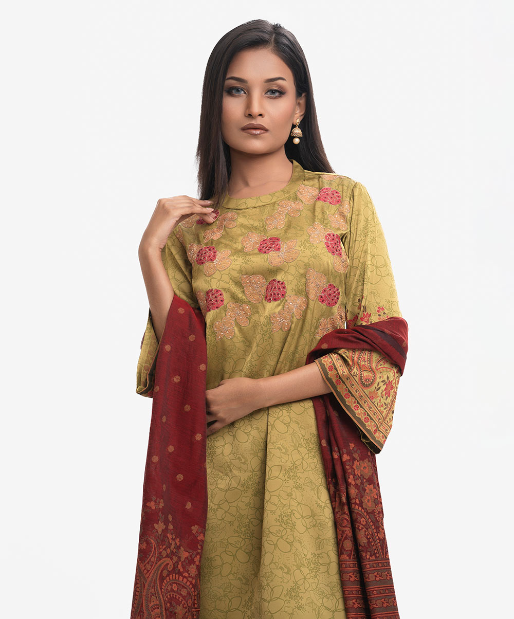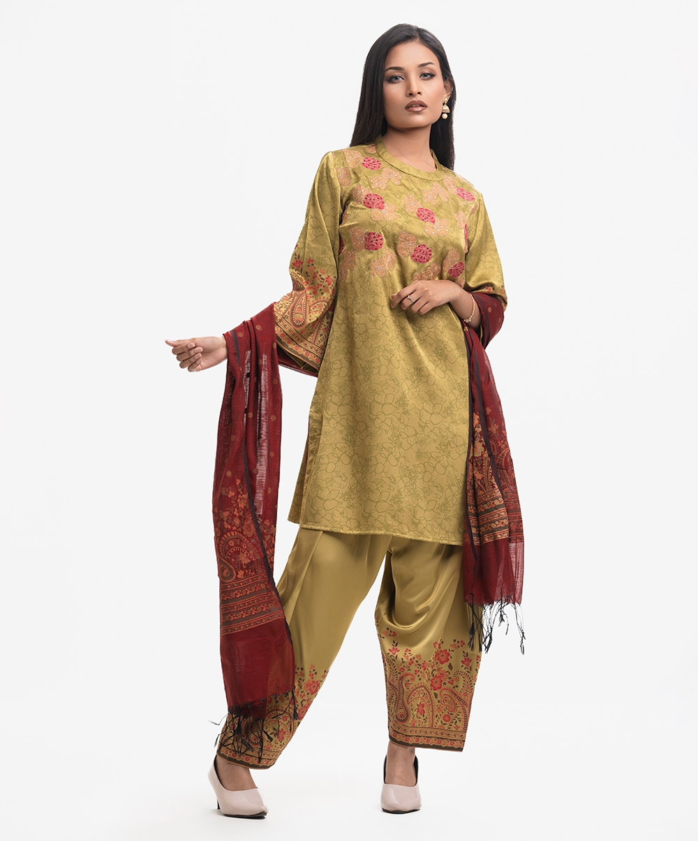 Women’s printed salwar kameez in georgette fabric. Mock neck, bell sleeves, embroidery & karchupi at the front of kameez. Half-silk dupatta with harem-style pajamas.