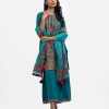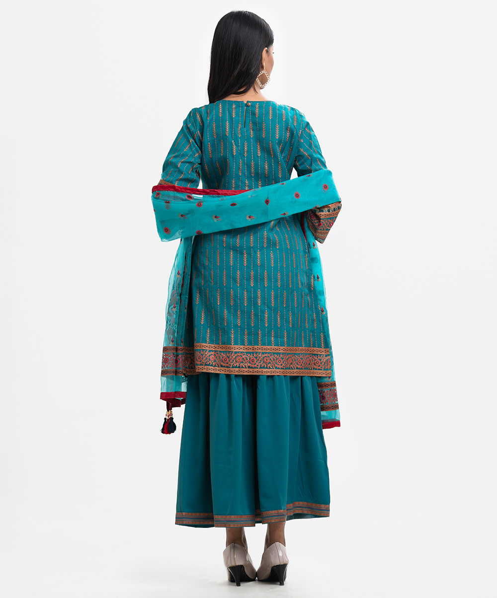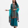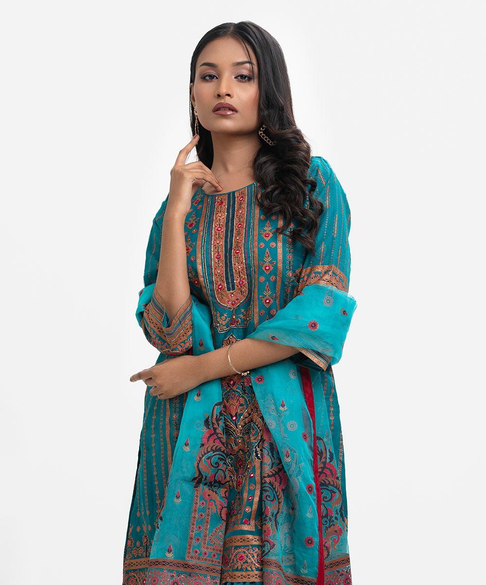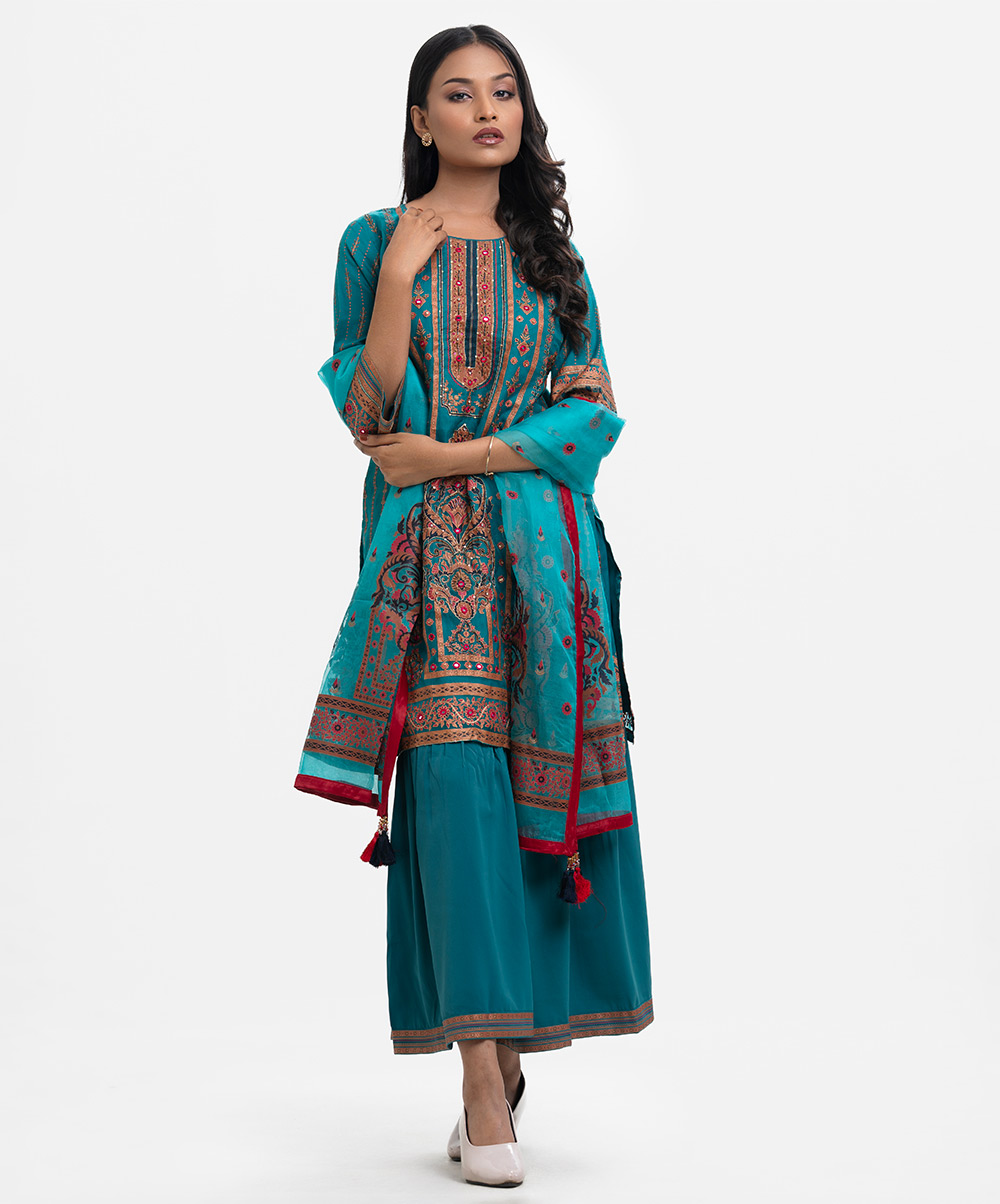 Women’s exclusive sharara salwar kameez in Nargisus by Le Reve. Muslin fabric front part kameez with georgette lining. Round neck, three-quarter sleeves and karchupi detail kameez. With a muslin dupatta & sharara pajama.