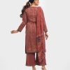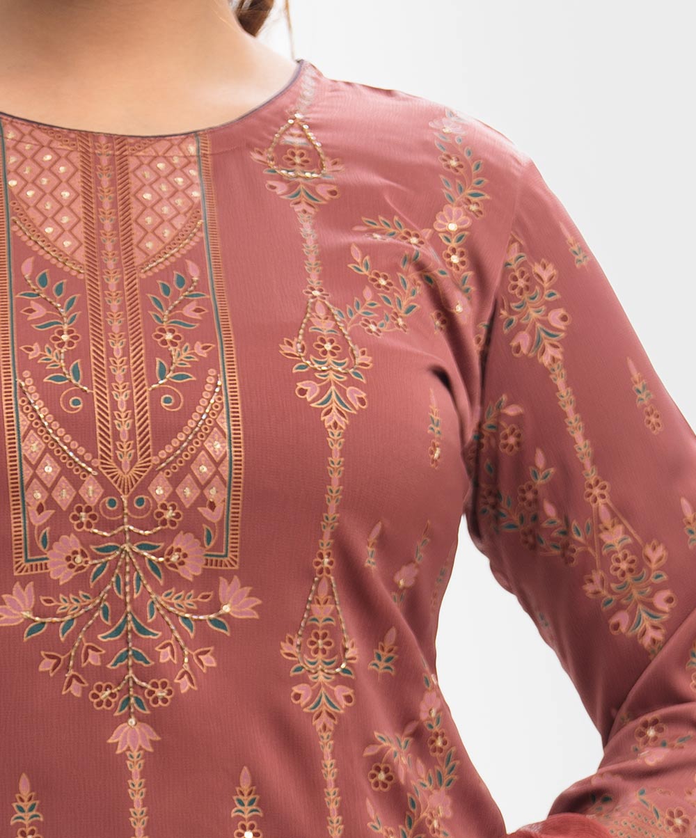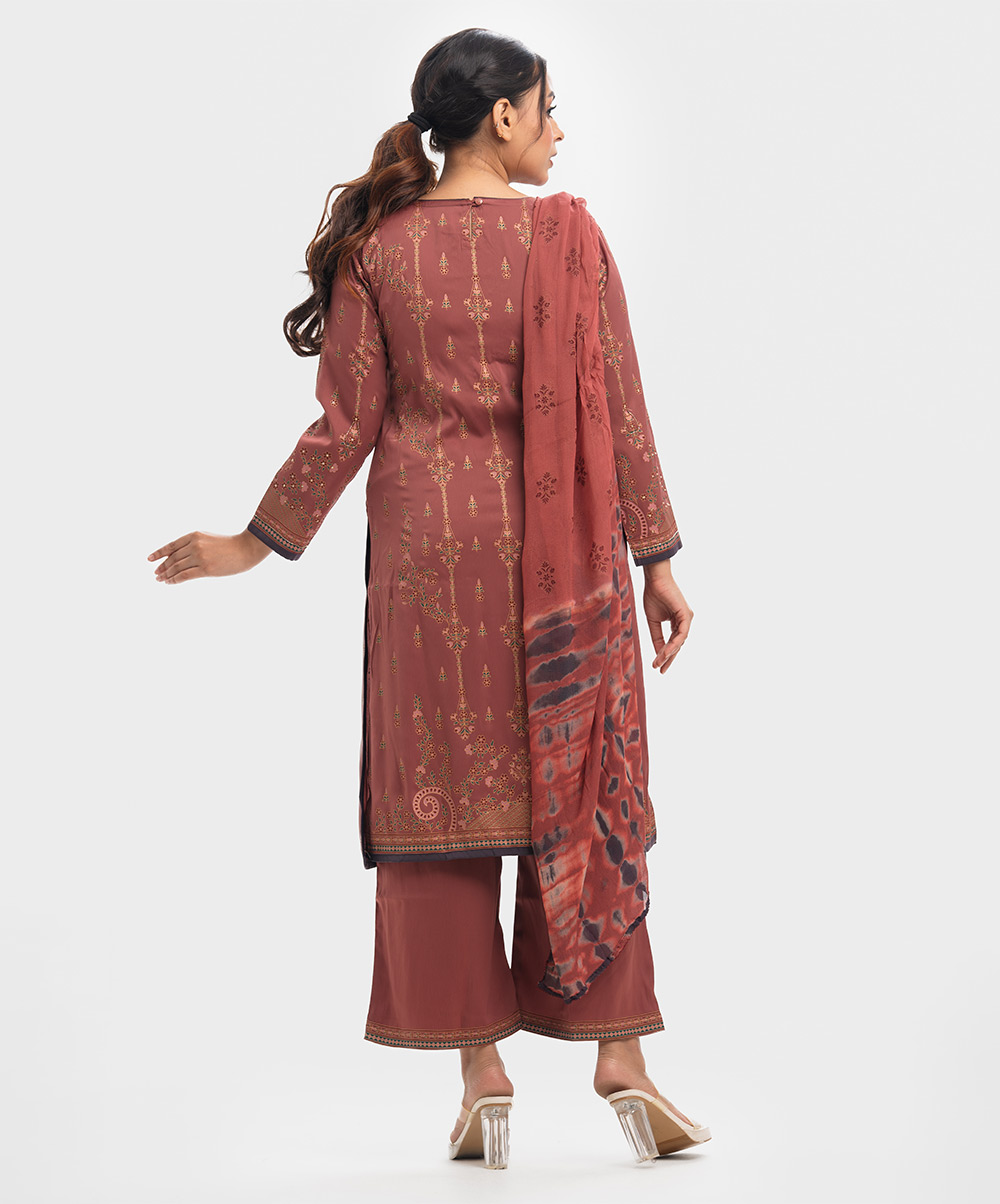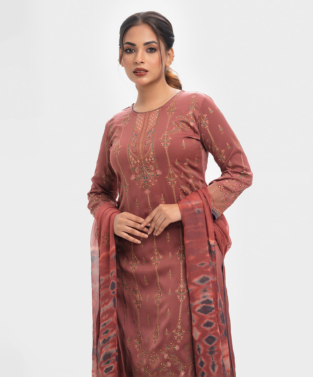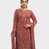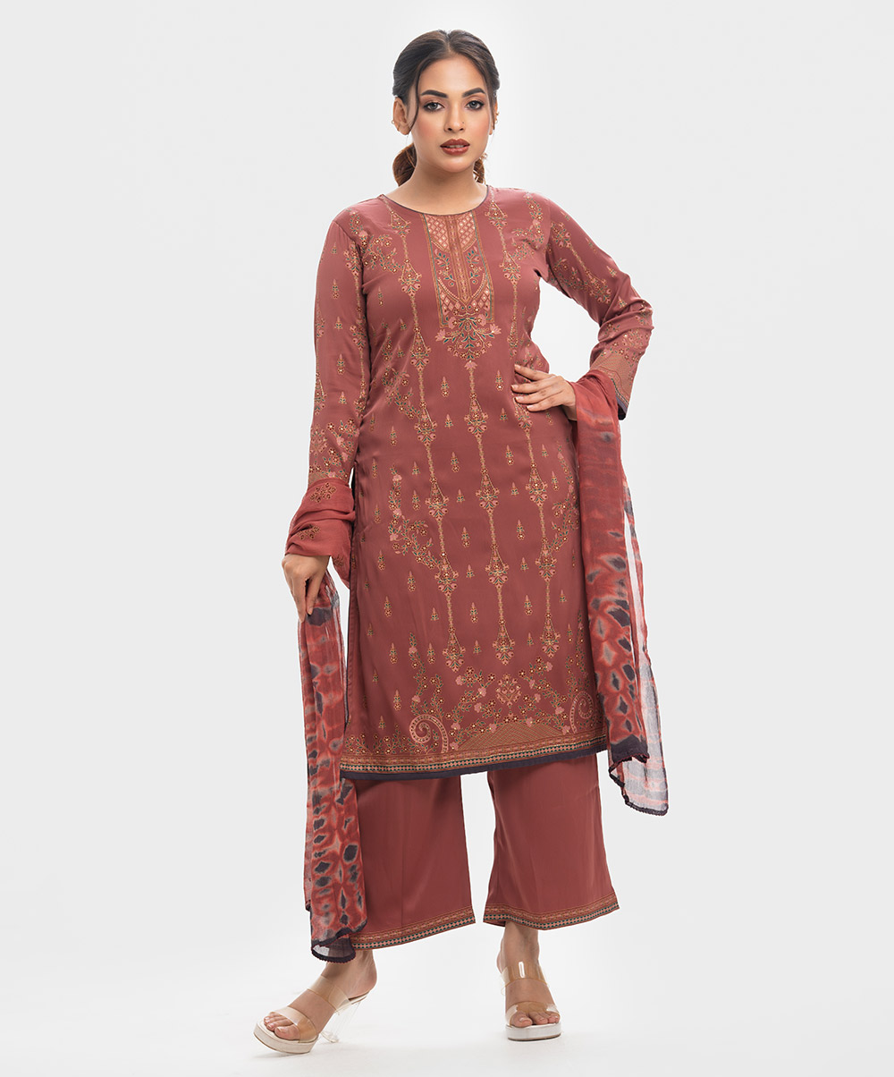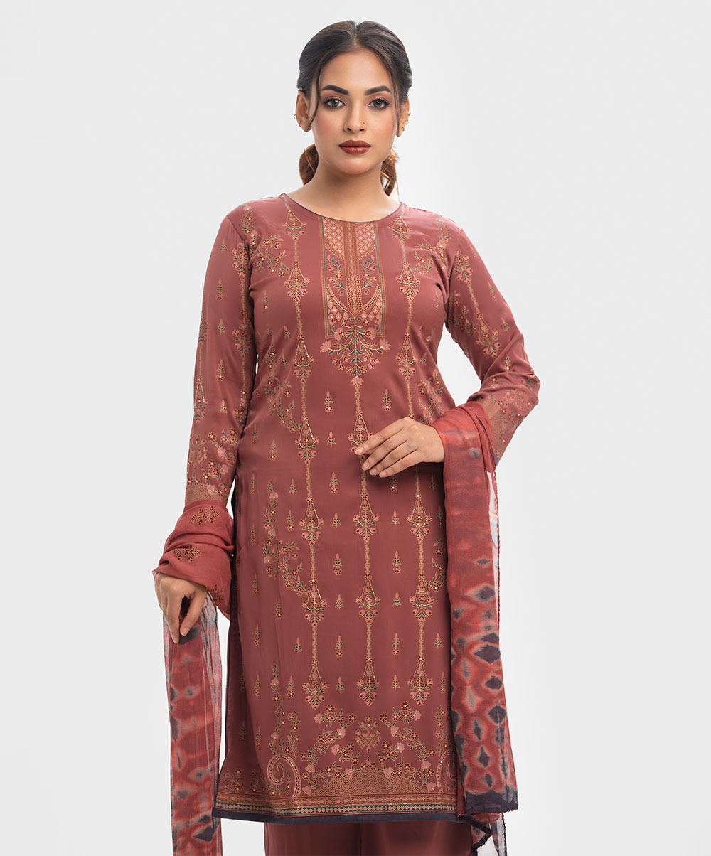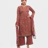 Women’s printed salwar kameez in joom fabric. Round neck, full sleeves and all over karchupi details on the kameez. Chiffon dupatta with palazzo pants.
